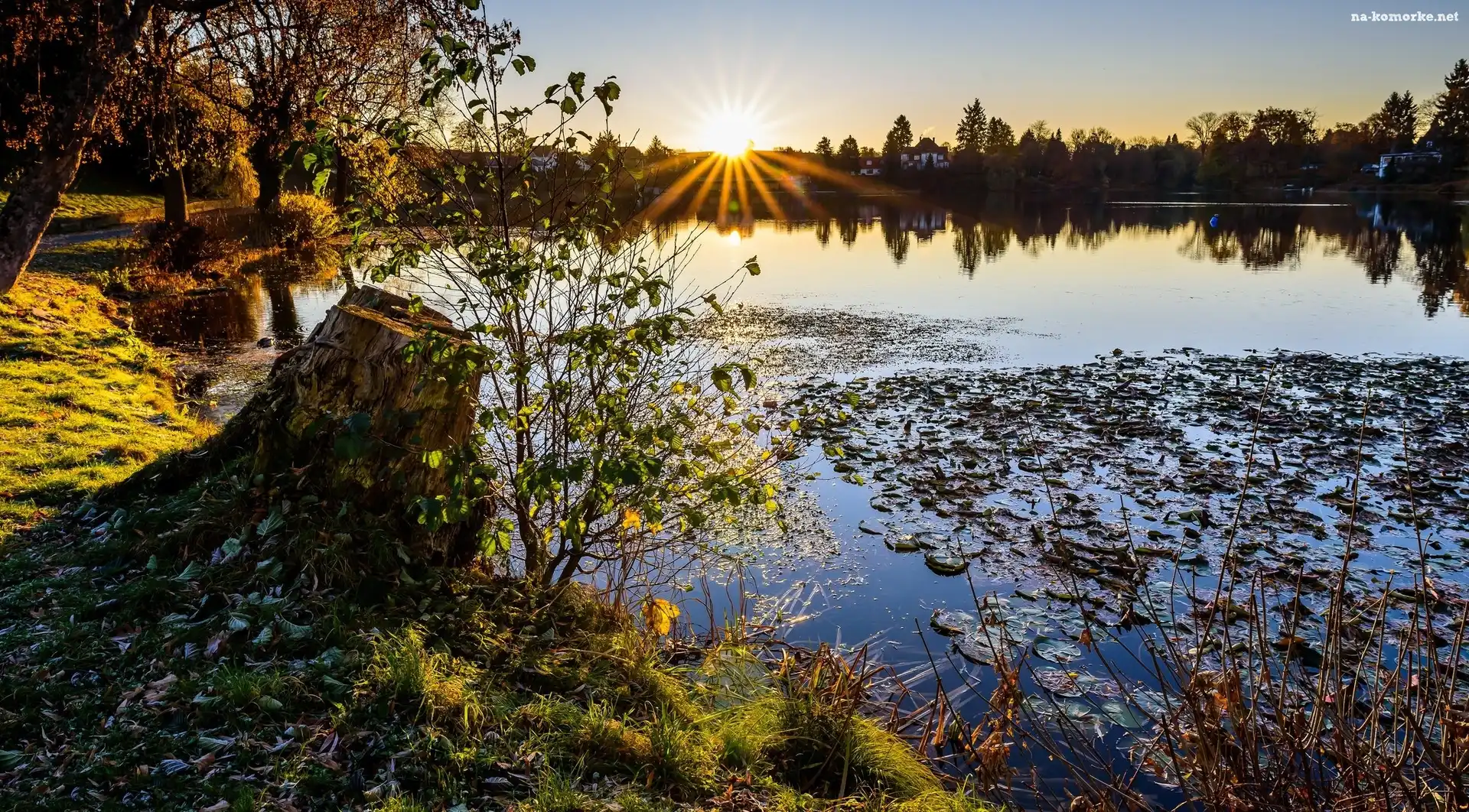 Staw, Promienie słońca, Lilie wodne, Drzewa na Komórkę