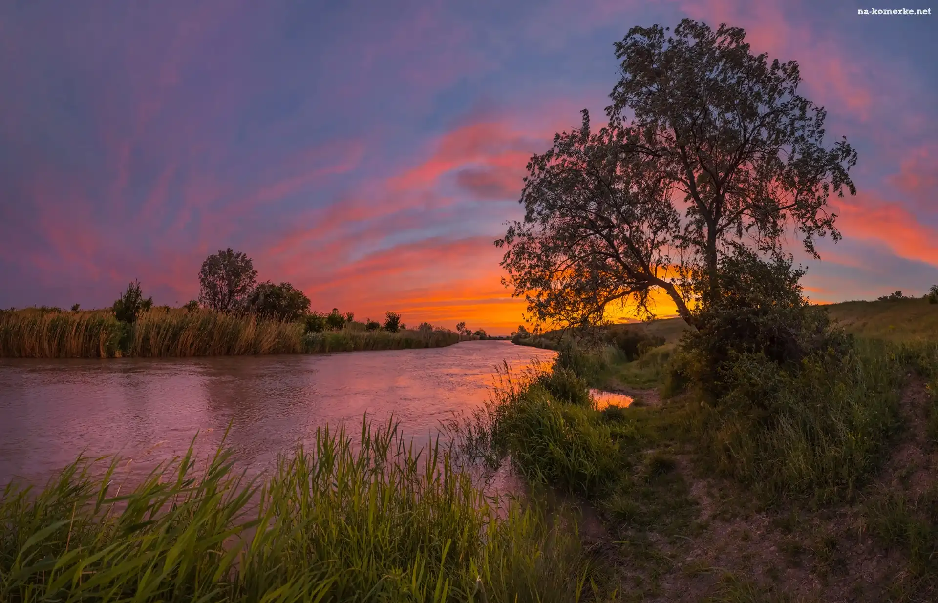 Rzeka, Kraj Stawropolski, Drzewa, Rosja, Kanał Nevinnomyssk, Roślinność, Zachód słońca, Stawropol na Komórkę |