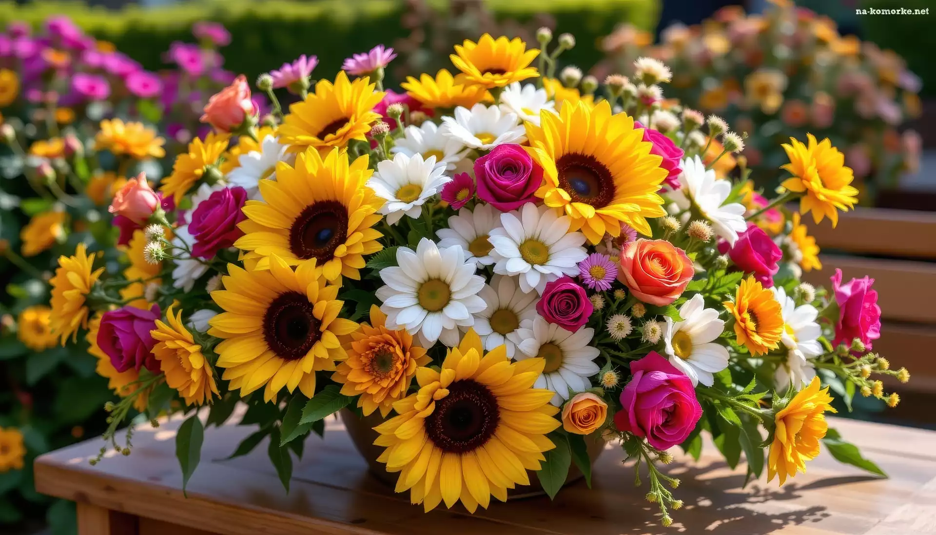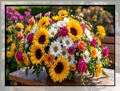 Bukiet, Wazon, Kwiaty, Stół, Róże, Stokrotki, Słoneczniki na Komórkę