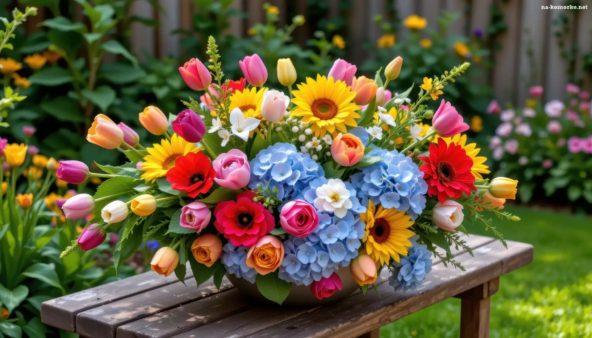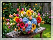 Bukiet, Kwiaty, Hortensje, Stół, Słoneczniki, Tulipany na Komórkę