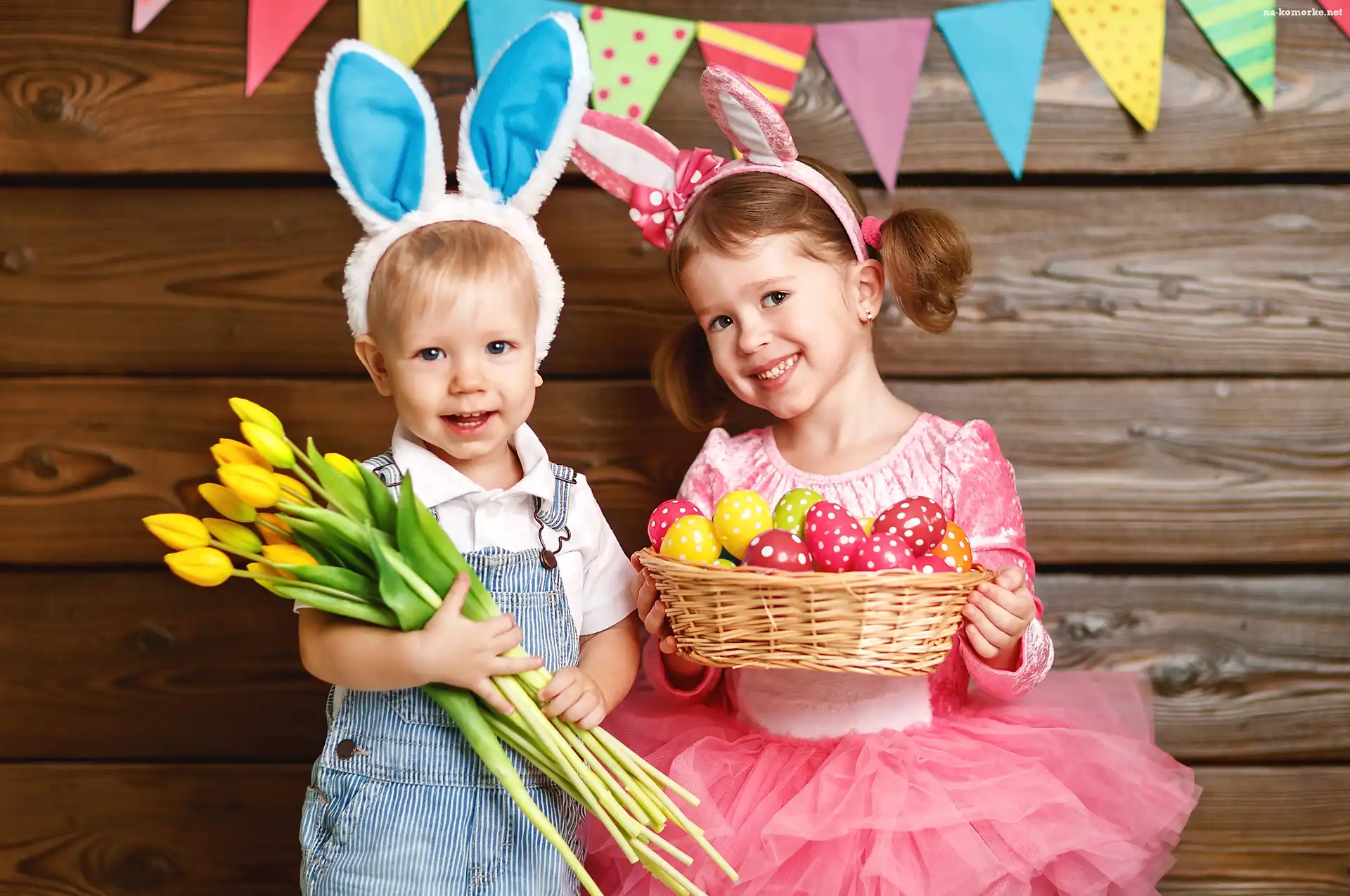 Dzieci, Stroje, Chłopczyk, Zajączki, Dziewczynka, Koszyk, Pisanki, Tulipany na Komórkę