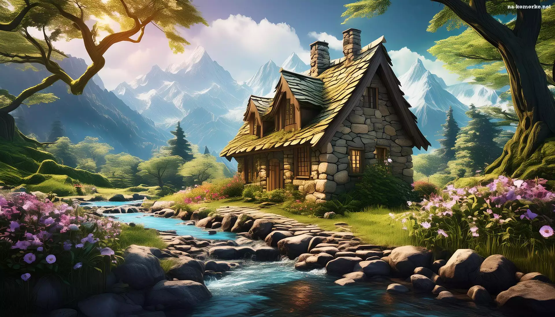 Dom, Strumień, Góry, Kwiaty, Grafika na Komórkę