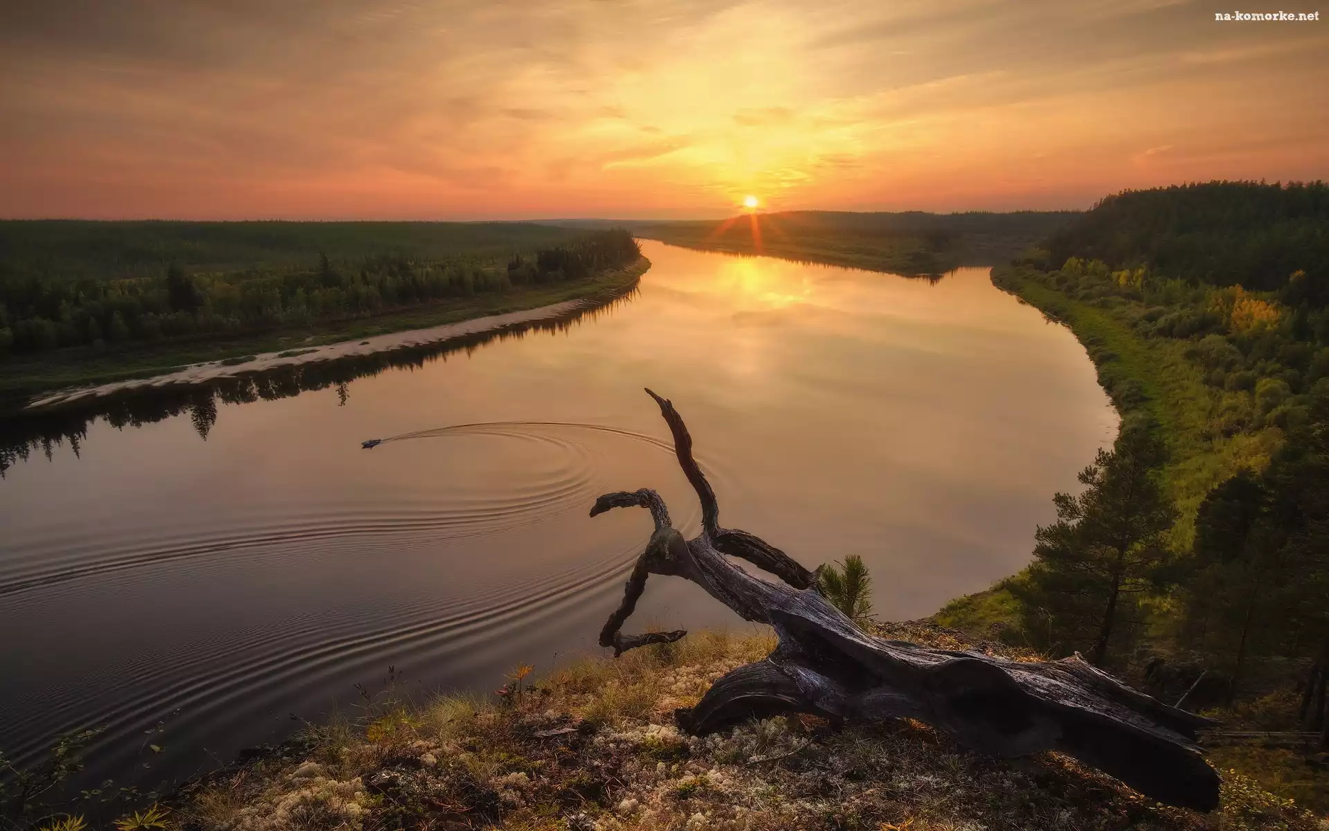 Łódka, Zachód słońca, Suchy, Lasy, Rosja, Rzeka Dolna Tunguzka, Obwód irkucki, Drzewa, Konar na Komórkę |