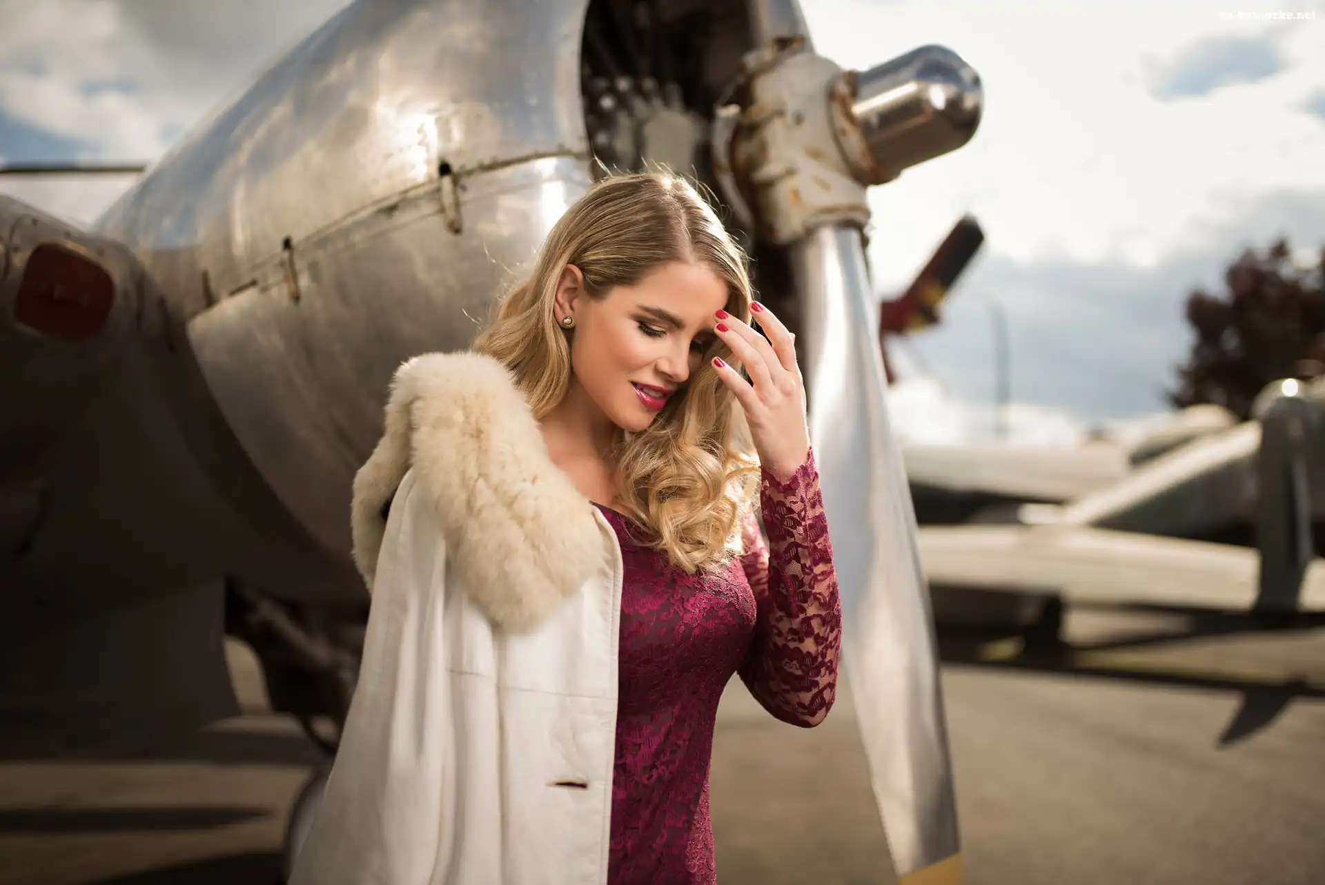Kobieta, Sukienka, Płaszcz, Samolot, Blondynka, Futrzany, Kołnierz, Bordowa na Komórkę