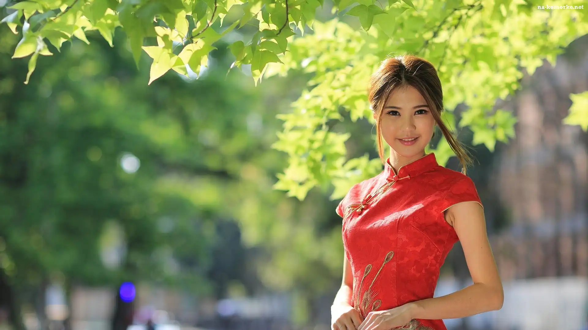 Azjatka, Sukienka, Drzewo, Czerwona, Kobieta na Komórkę