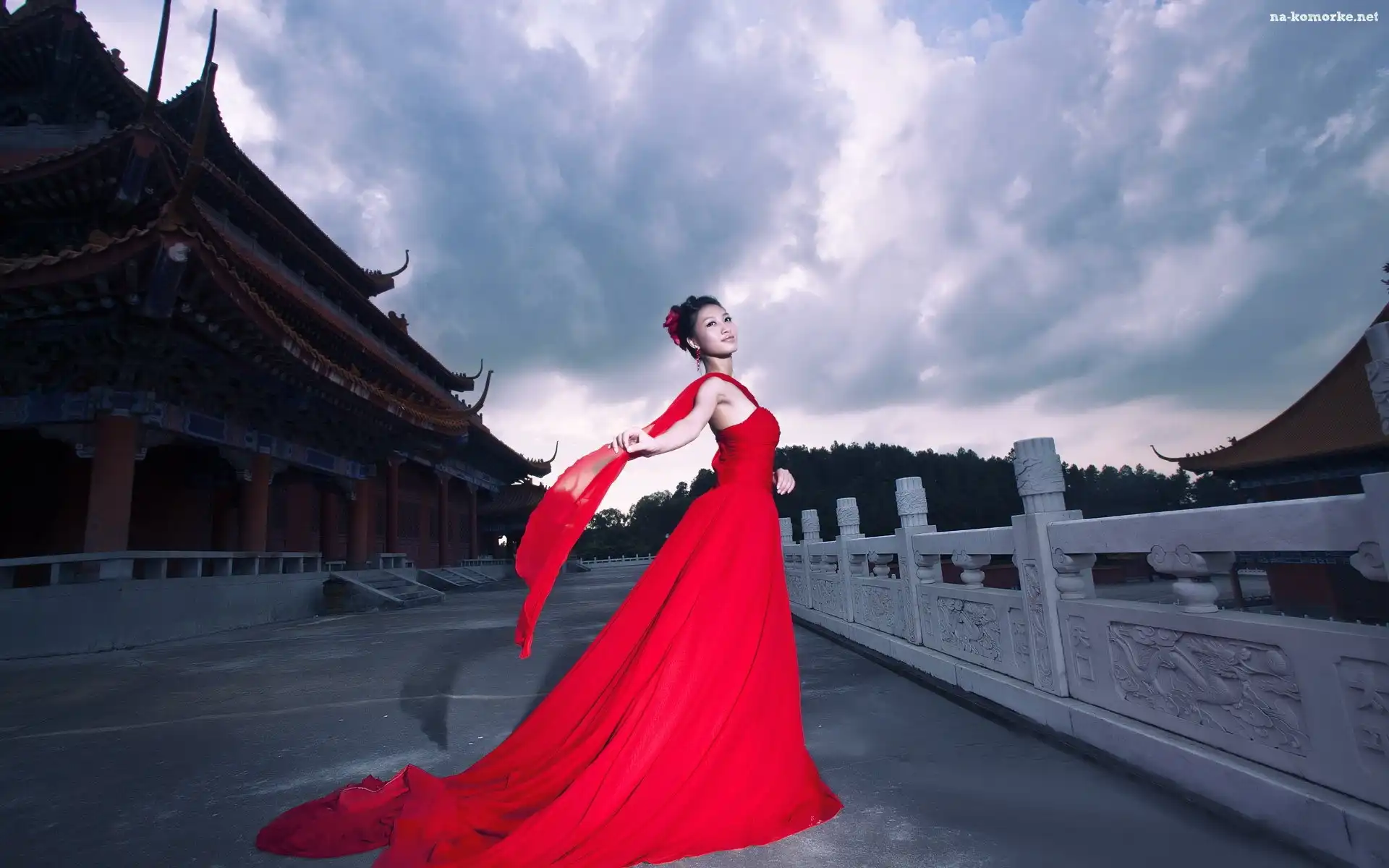 Suknia, Pagody, Elegancka, Kobieta, Czerwona na Komórkę