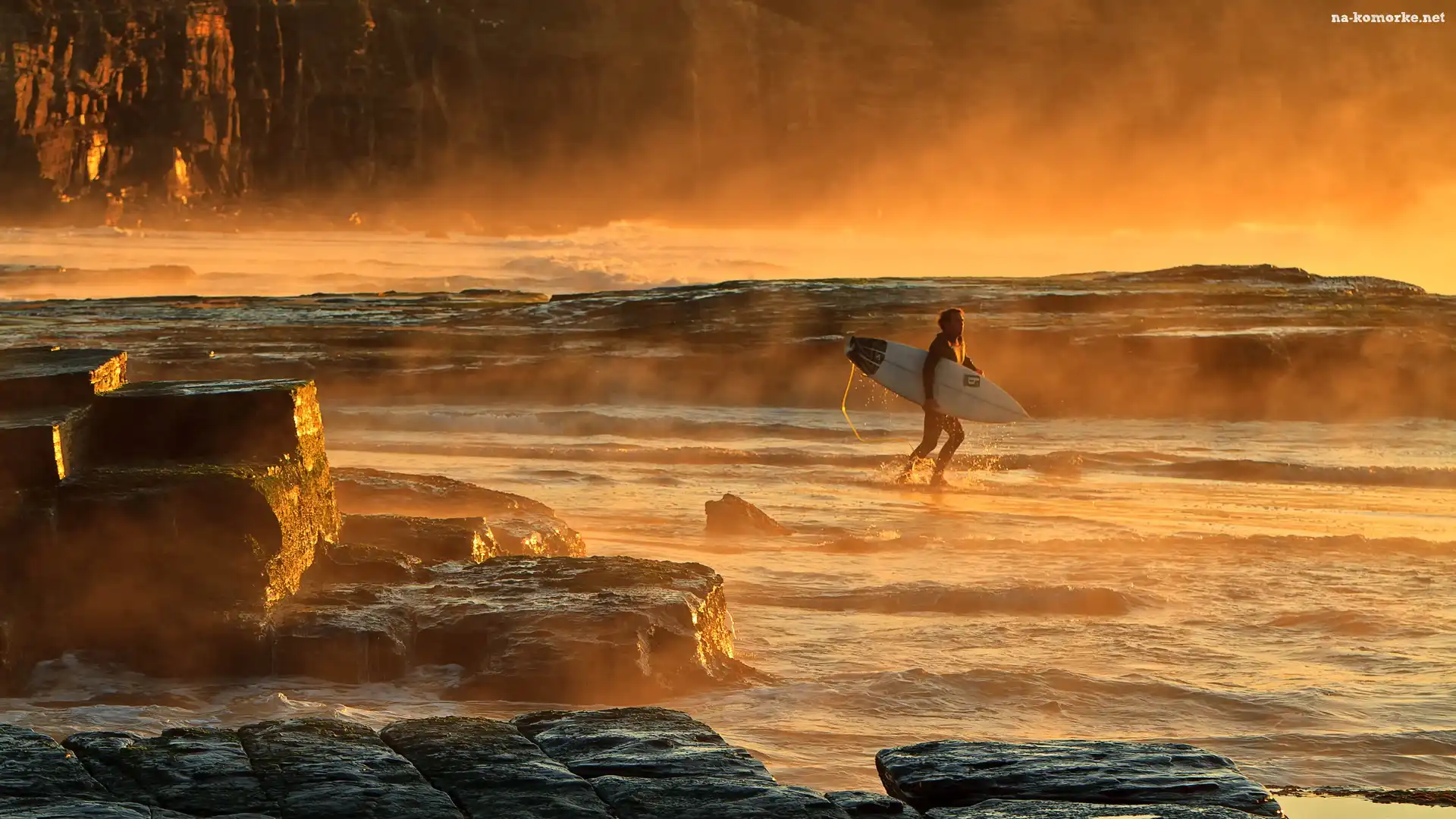 Surfing, Morze, Skały, Zachód, Słońca na Komórkę