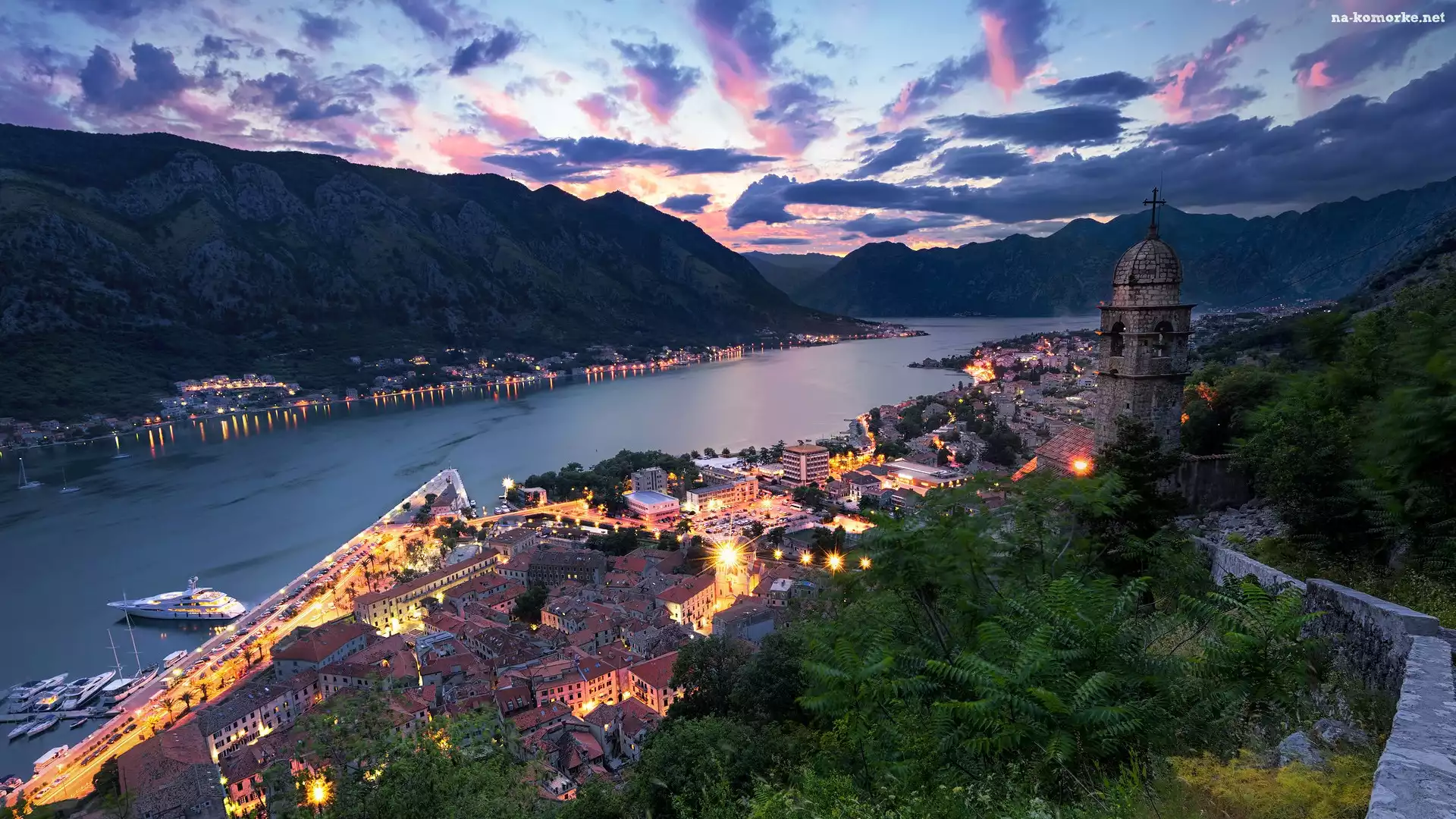Światła, Zatoka Kotorska, Góry, Czarnogóra, Kotor, Domy, Stare Miasto na Komórkę