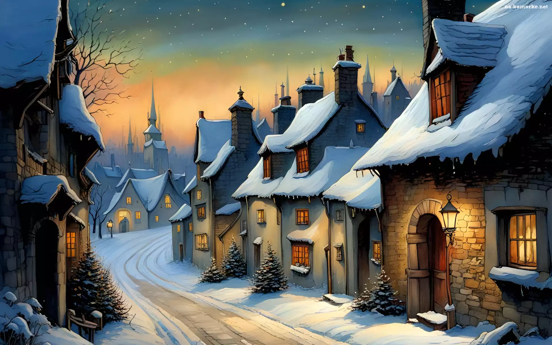 Światła, Choinki, Niebo, Drzewka, Uliczka, Domy, Zima, Latarnie, Śnieg na Komórkę