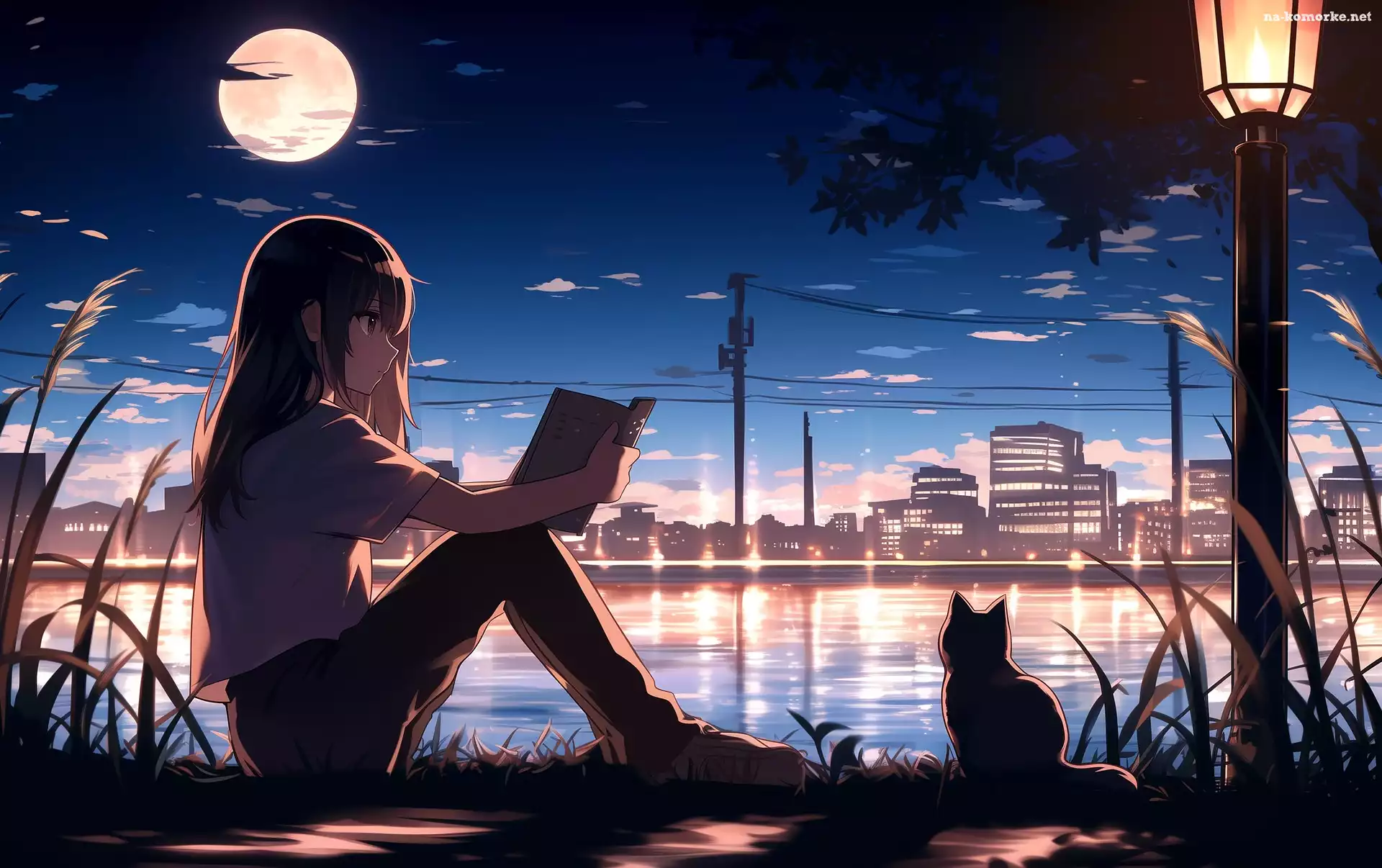Miasto, Panorama, Anime, Światło, Dziewczyna, Kot, Wieczór na Komórkę