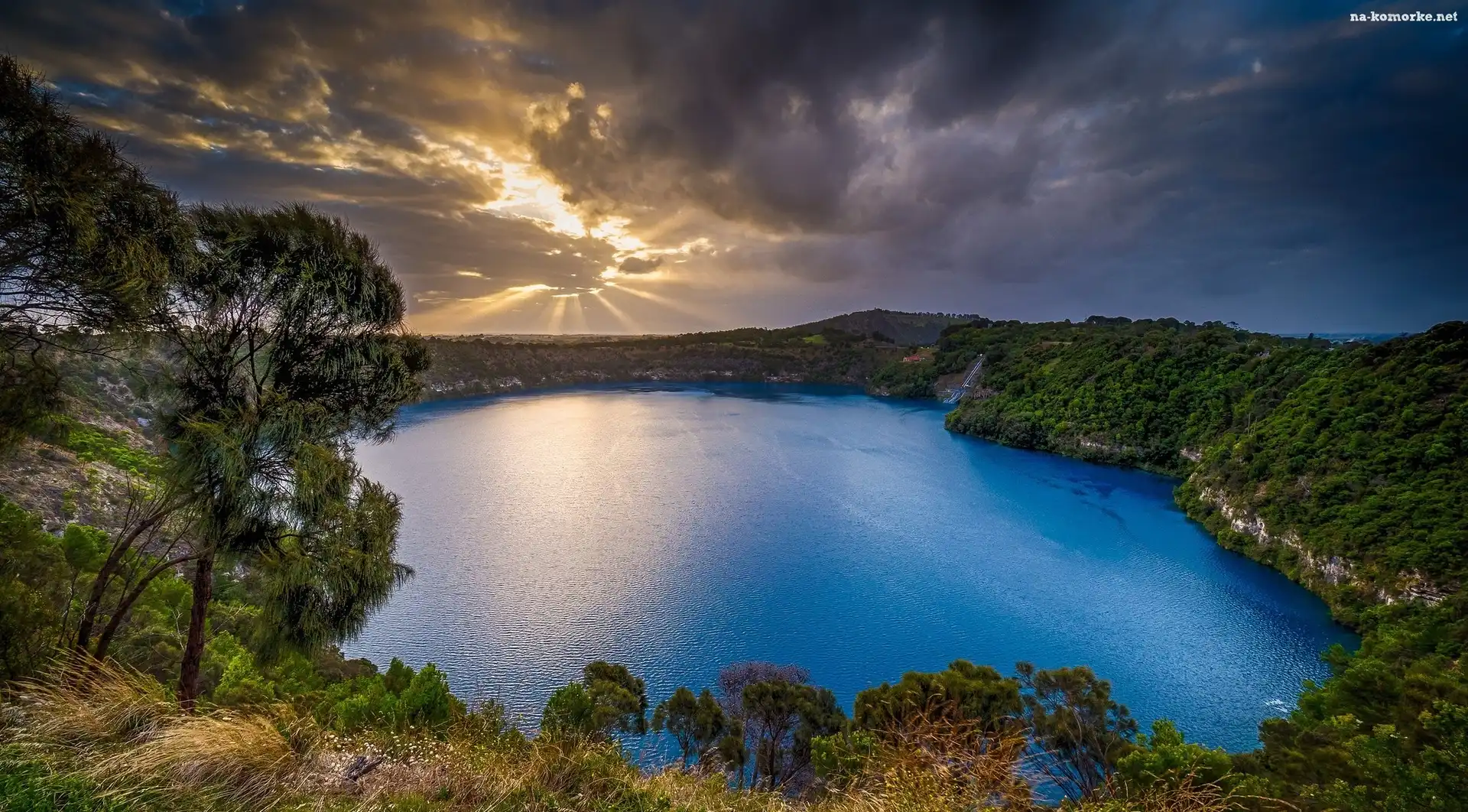 Przebijające światło, Australia, Jezioro Blue Lake, Drzewa, Chmury na Komórkę