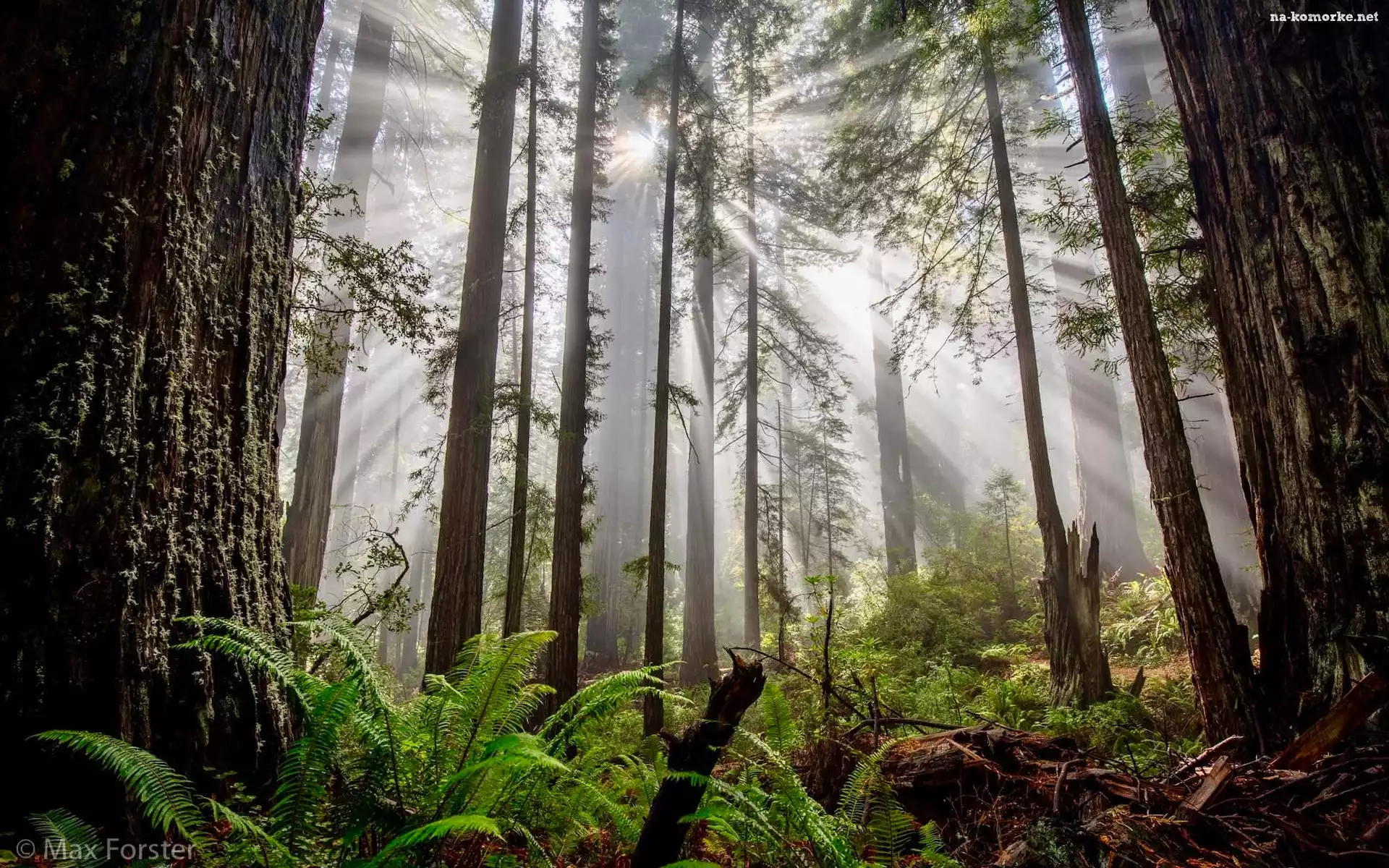 Las, Paprocie, Przebijające światło, Drzewa, Mgła na Komórkę