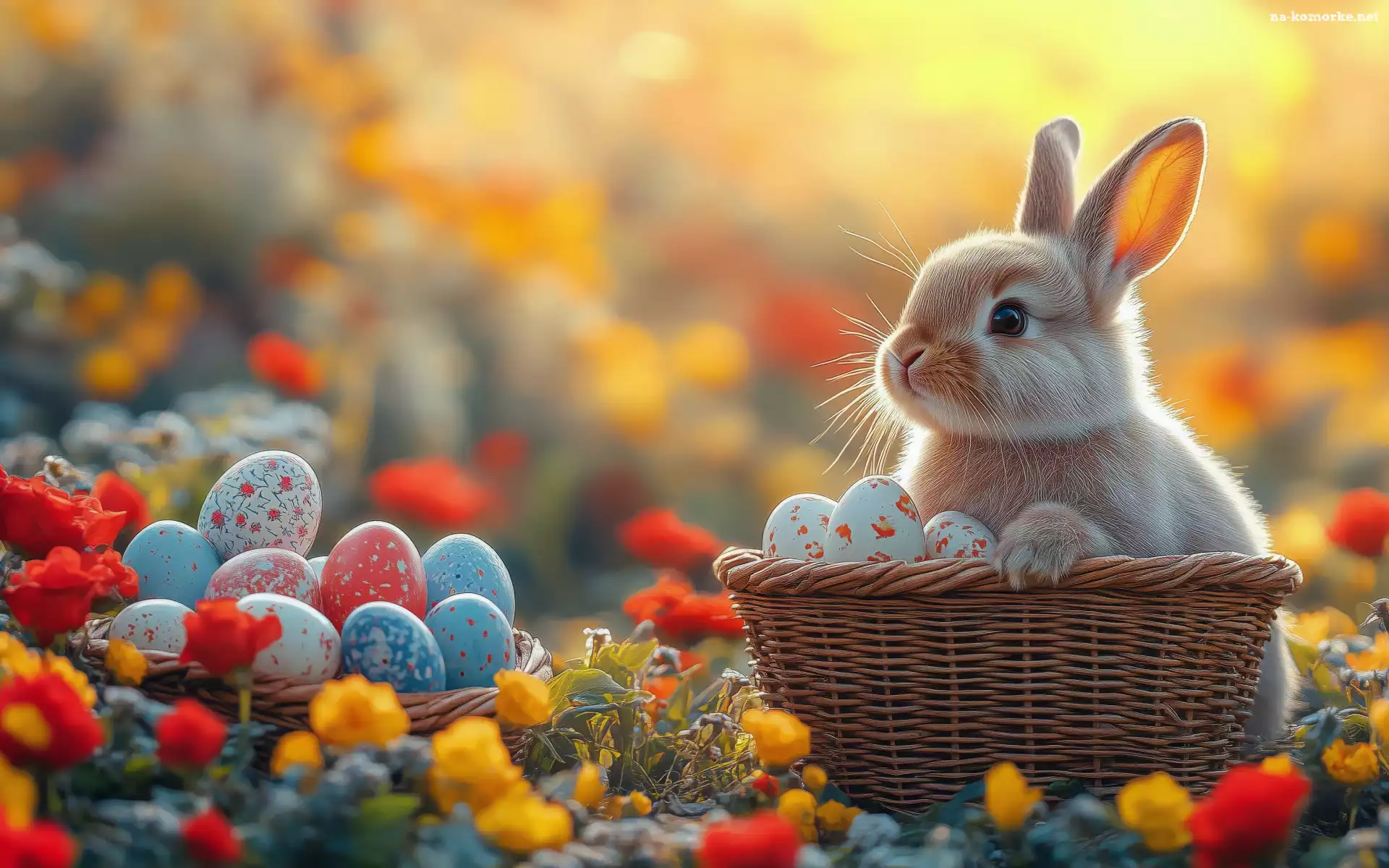 Pisanki, Kwiaty, Wielkanoc, Światło, Koszyk, Kolorowe, Królik na Komórkę