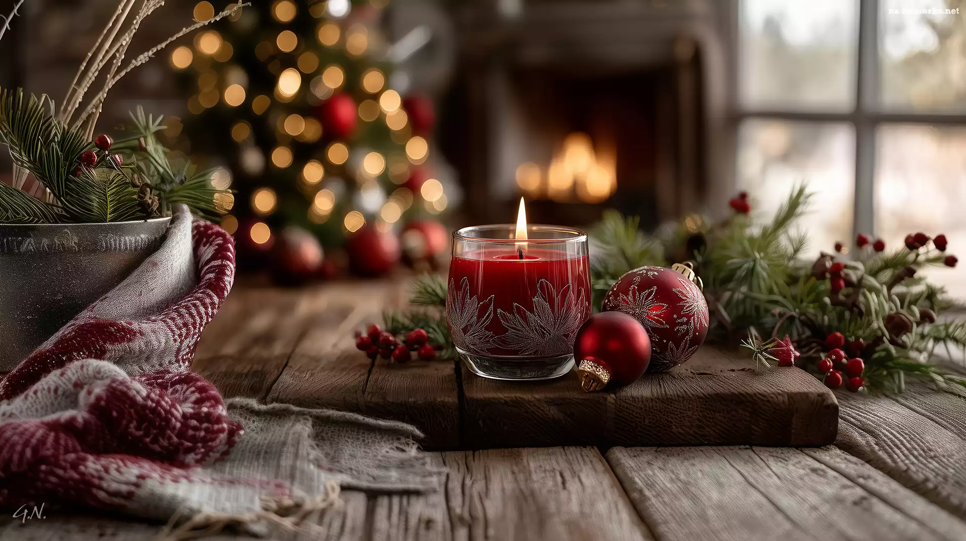 Grafika AI, Czerwona, Świąteczne, Boże Narodzenie, Bombki, Świeca na Komórkę