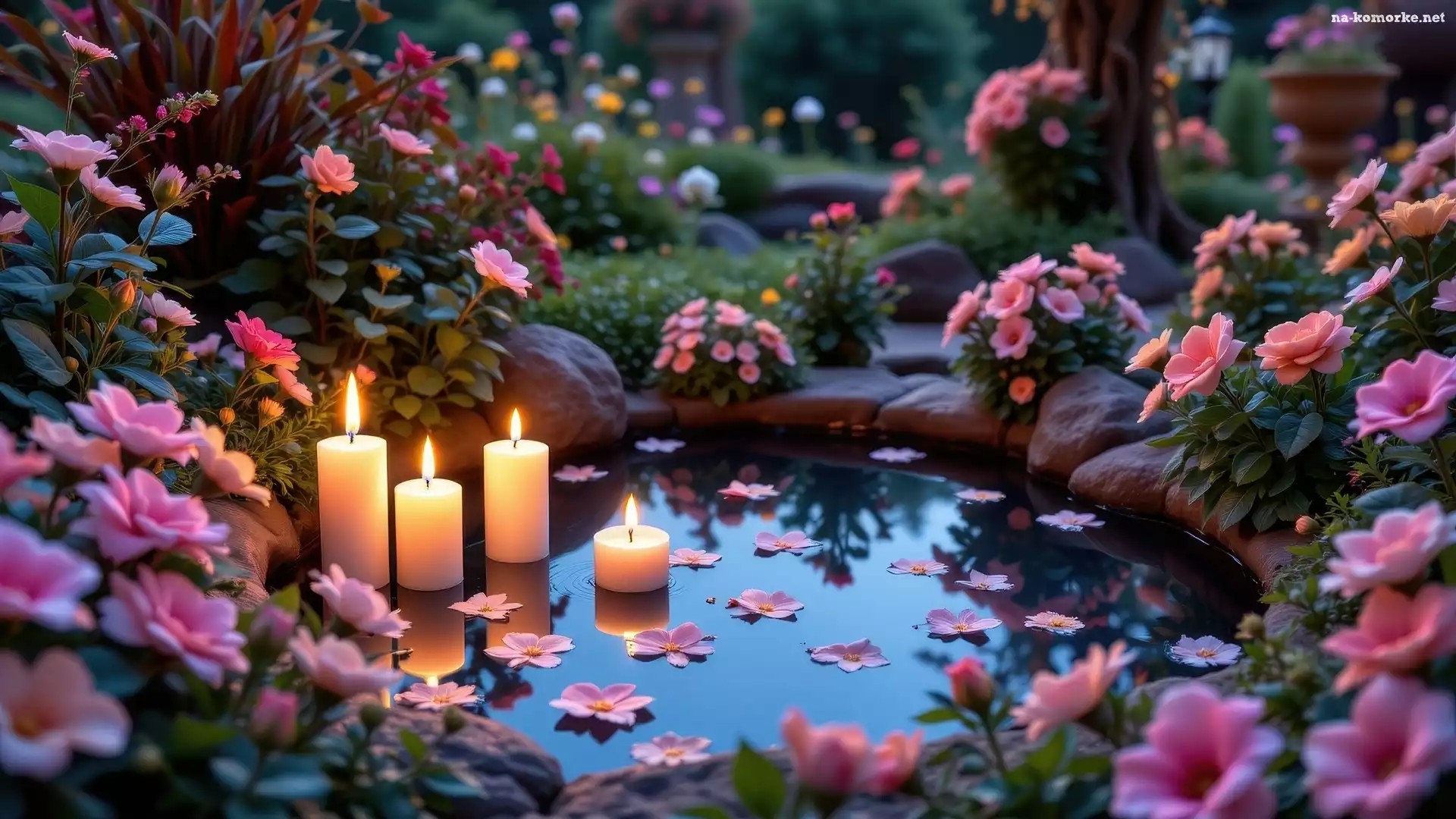 Płonące, Ogród, Kwiaty, Świece, Różowe, Oczko wodne na Komórkę