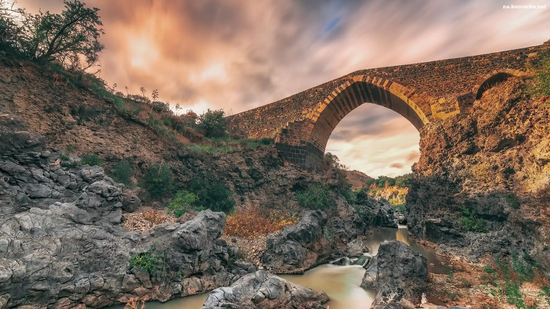 Rzeka Simeto, Sycylia, Kamienny, Włochy, Skały, Most, Ponte dei Saraceni, Drzewa na Komórkę