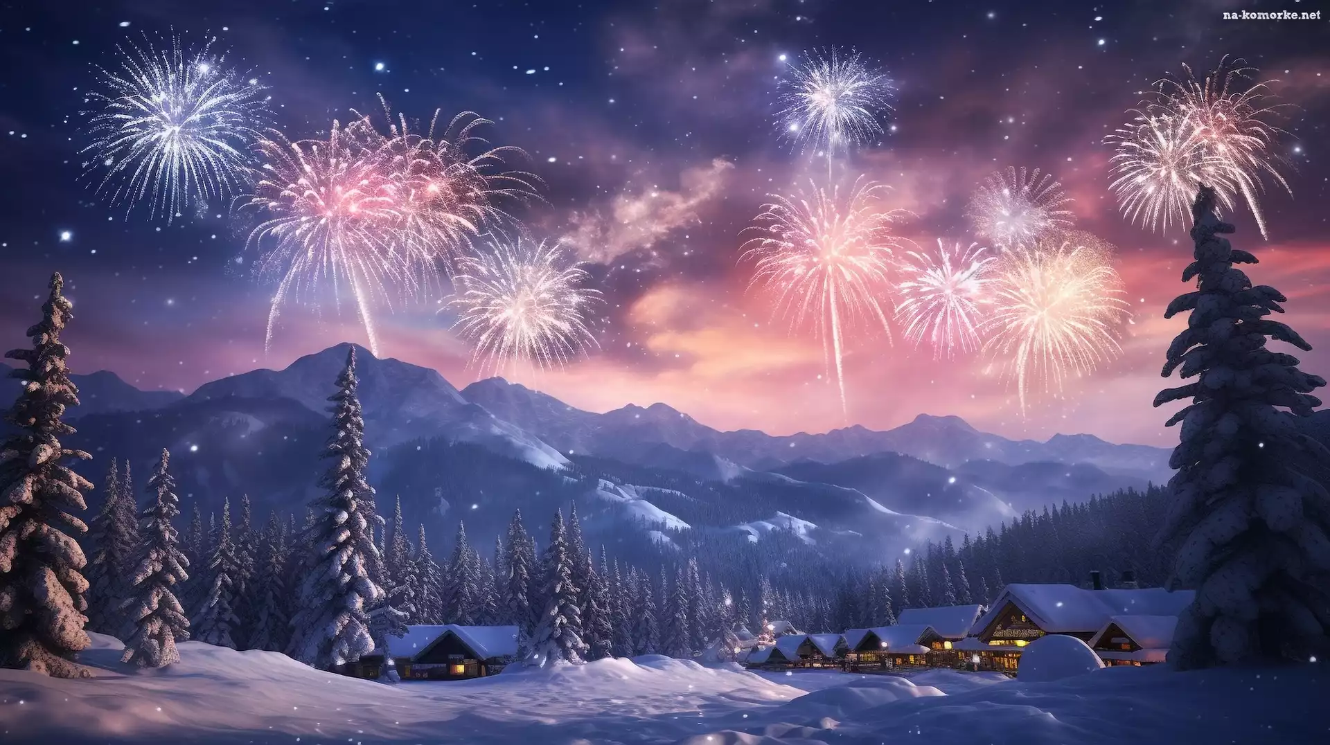 Góry, Fajerwerki, Drzewa, Grafika, Choinki, Domy, Zima, Sylwester na Komórkę