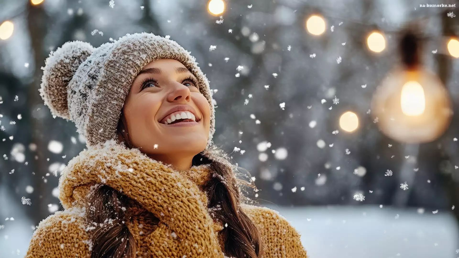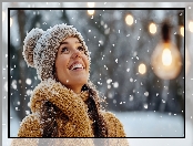 Śnieg, Czapka, Kobieta, Szal, Szatynka, Uśmiech, Długowłosa na Komórkę