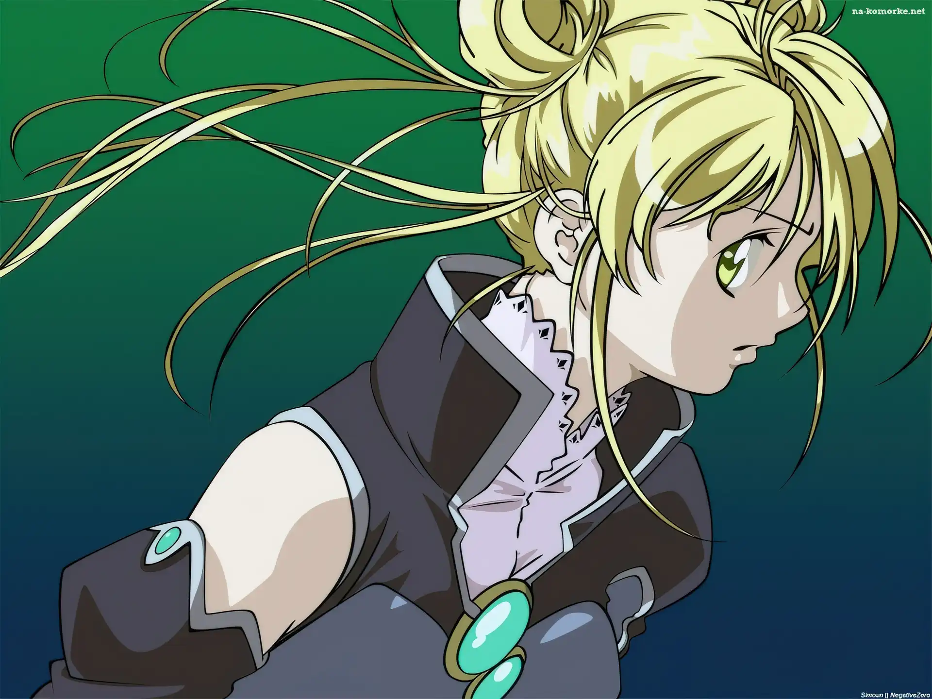 Simoun, twarz, niebieskie oczy Simoun, kobieta, fioletowy naszyjnik Simoun, dziewczynka, warkocze Simoun, przyjaciele Simoun, szary strój Simoun, zdjęcie, kotwica Simoun, plecak, lizak