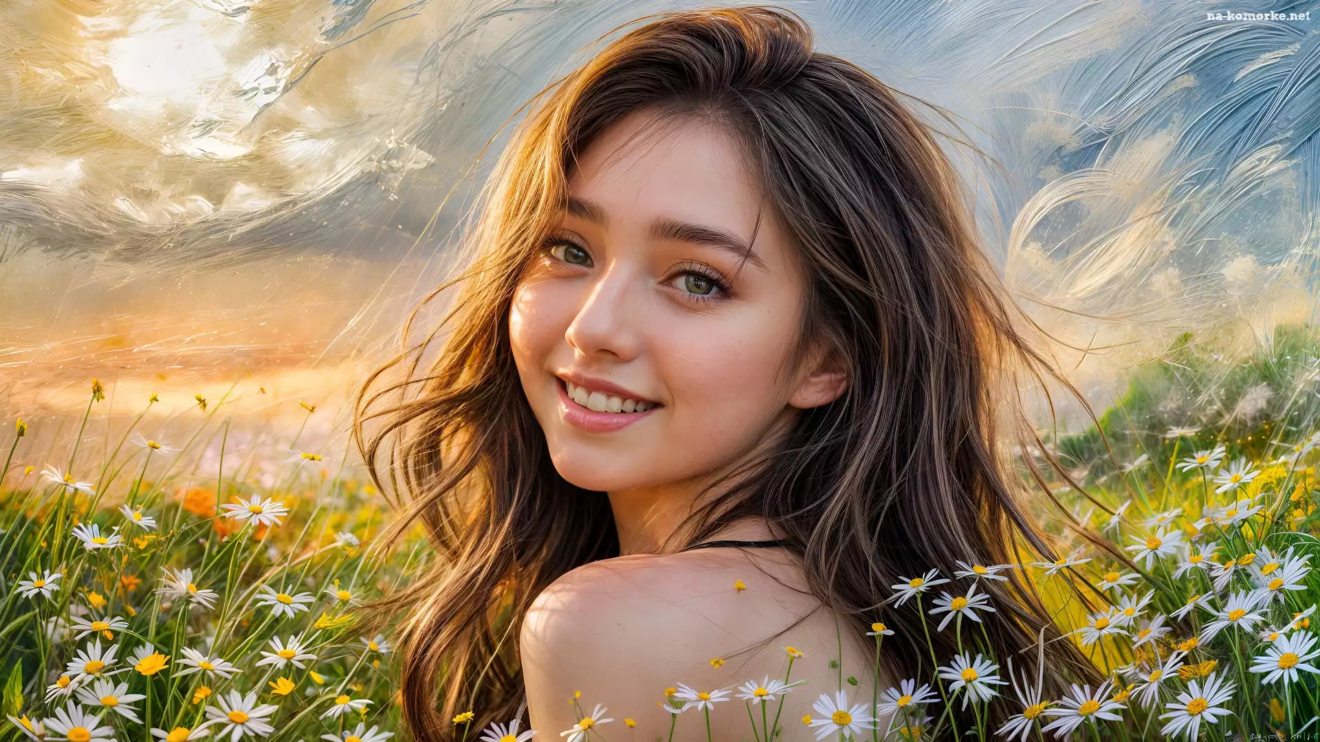 Kobieta, Szatynka, Grafika, Uśmiechnięta, Kwiaty na Komórkę