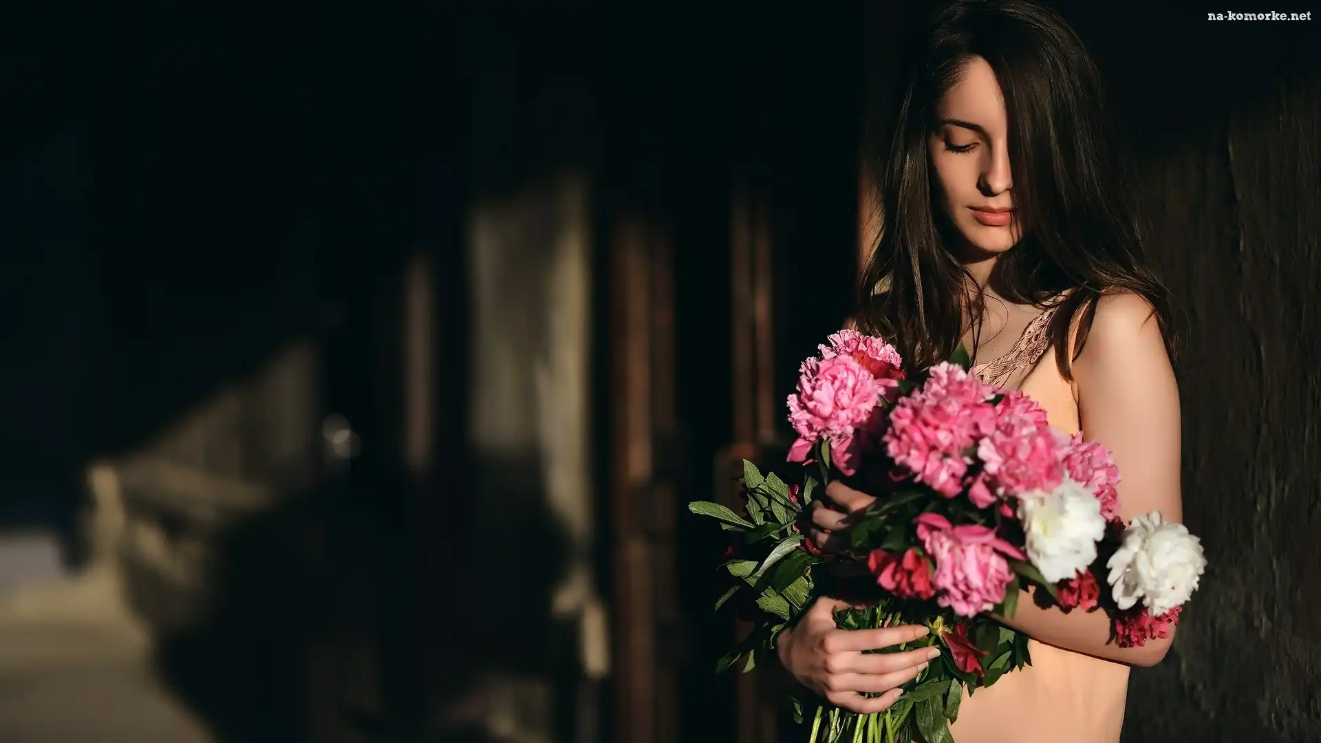 Kwiaty, Piwonie, Dziewczyna, Szatynka na Komórkę
