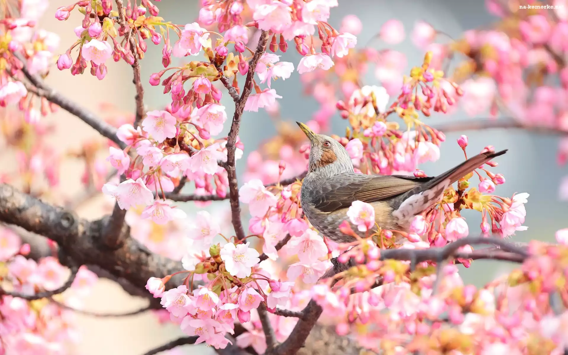 Ptak, Różowe, Kwiaty, Szczeciak rudouchy, Drzewo owocowe na Komórkę