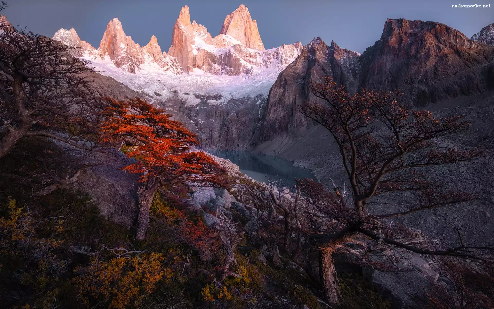 Szczyt Fitz Roy, Jezioro, Argentyna, Drzewa, Ośnieżone, Góry, Patagonia na Komórkę