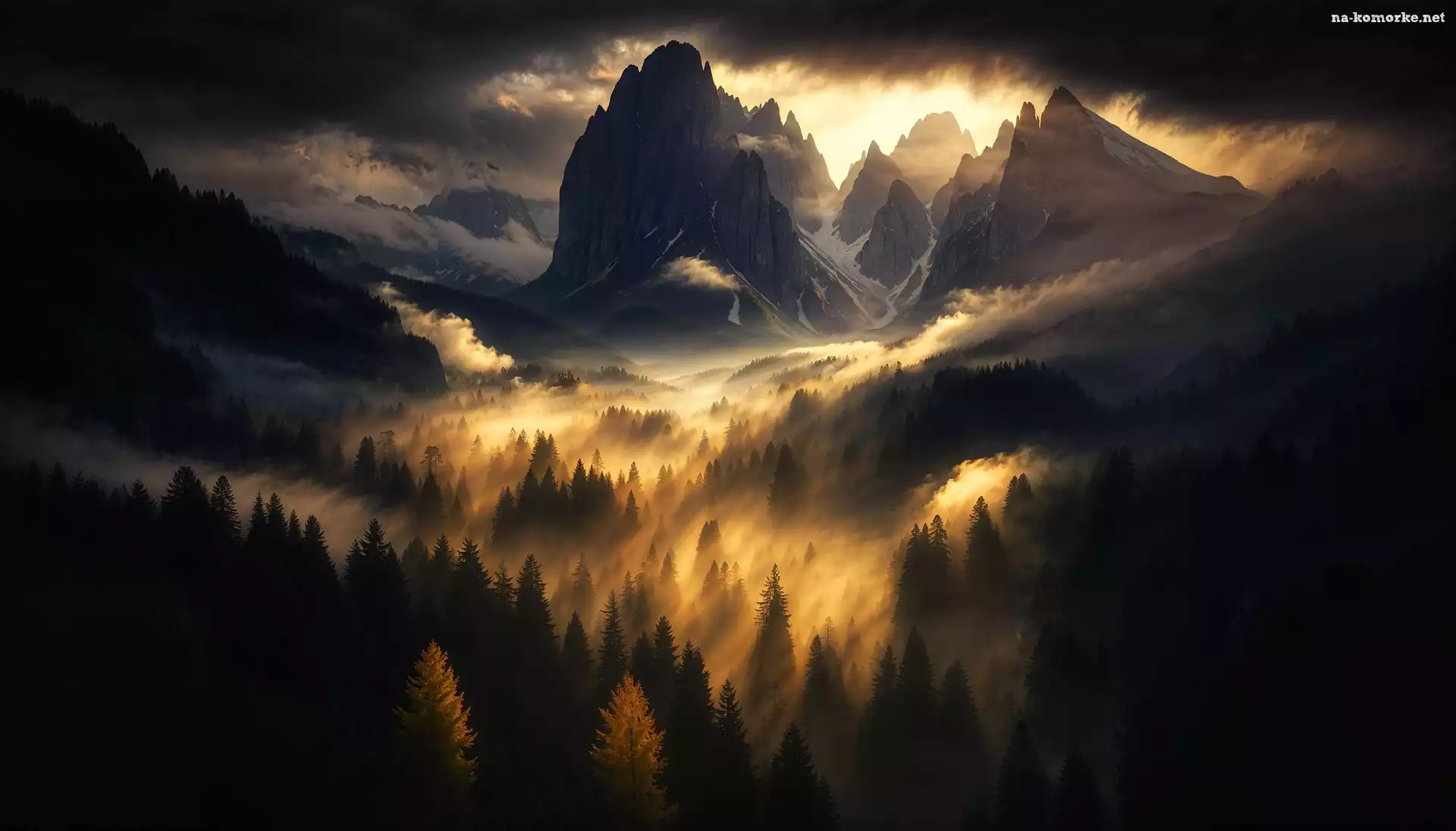 Góry, Drzewa, Mgła, Szczyty, Zachód słońca na Komórkę