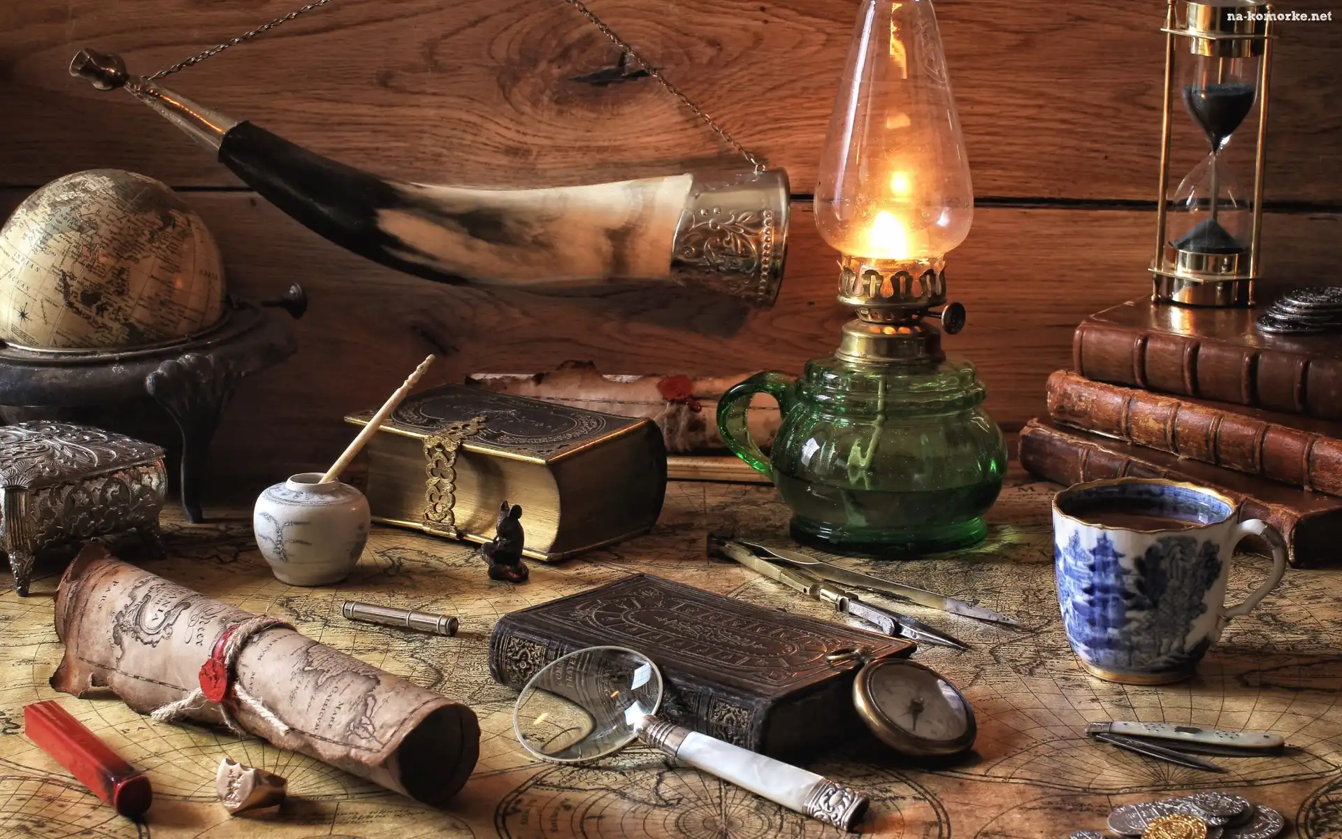 Szkatułka, Kompozycja, Mapy, Lupa, Zegarek, Lampa naftowa, Róg, Kubek, Książki, Kompas, Klepsydra, Globus na Komórkę |
