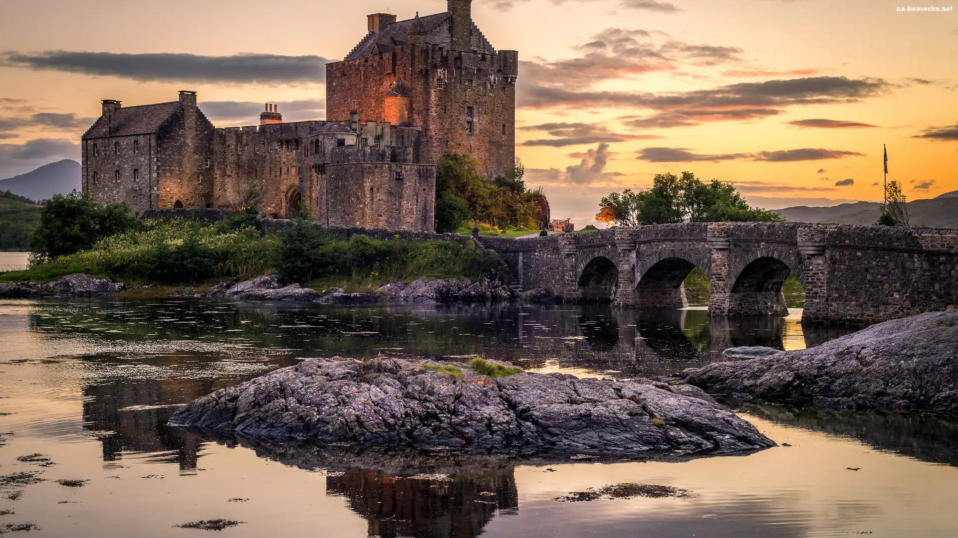 Chmury, Zamek Eilean Donan Castle, Szkocja, Zachód słońca, Most, Jezioro Loch Duich na Komórkę