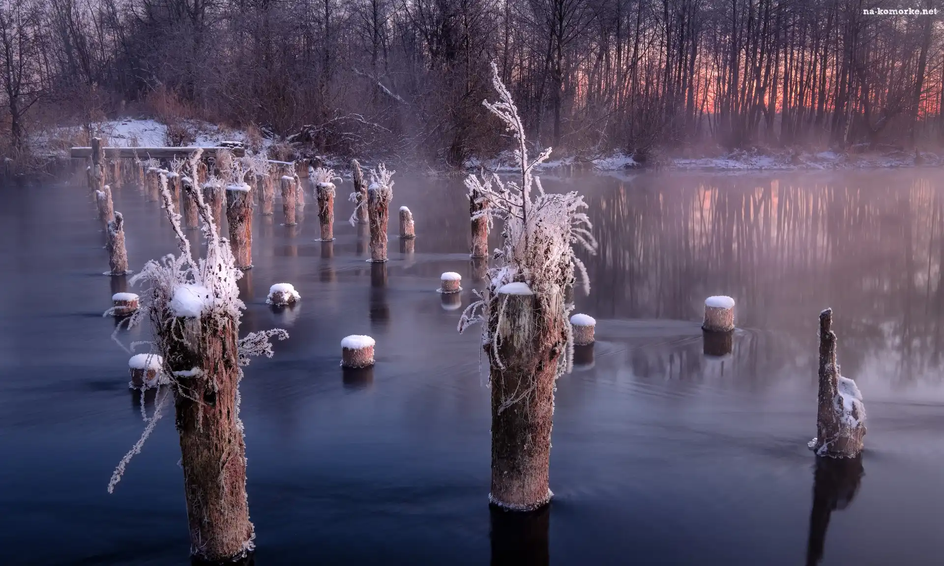Szron, Zima, Rzeka, Drzewa, Kołki na Komórkę