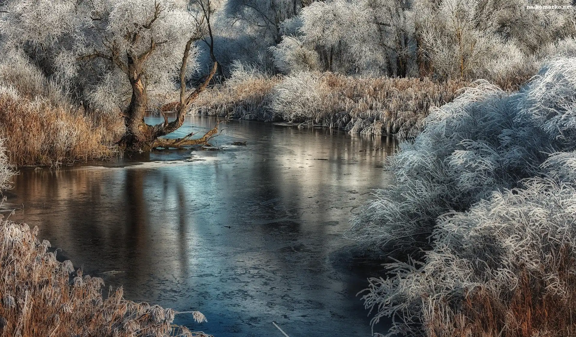 Szron, Zima, Rzeka, Drzewa, Trawy na Komórkę