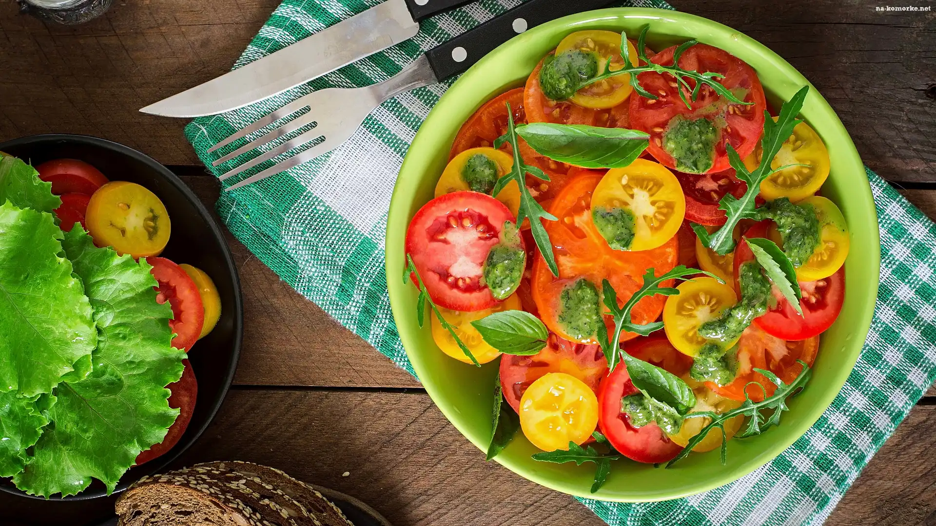 Sztućce, Sałatka, Pomidory, Chleb, Miska na Komórkę