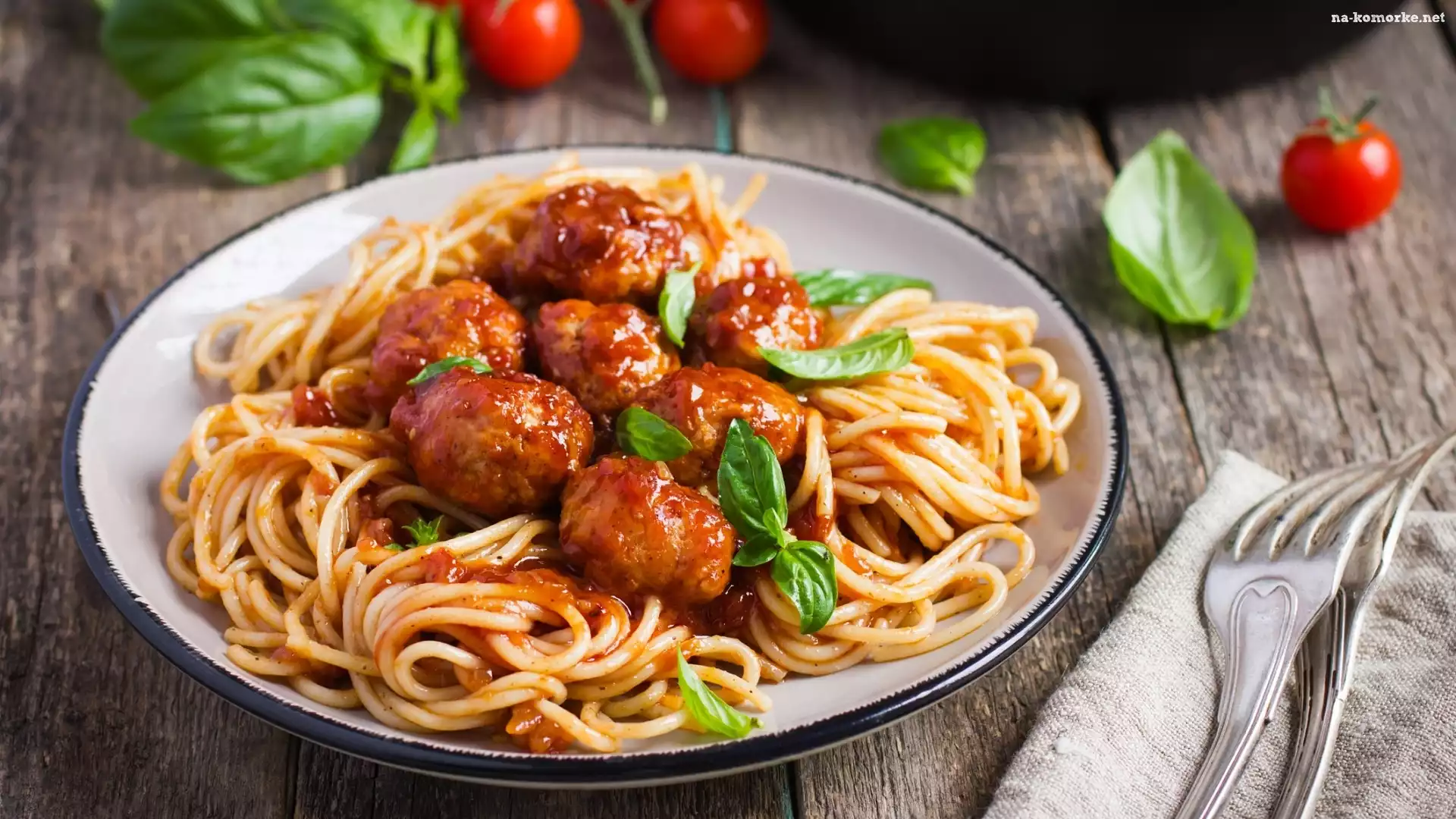 Sztućce, Makaron, Sos, Pulpety, Talerz na Komórkę
