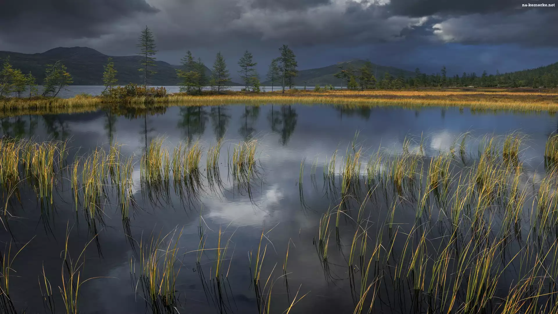 Szuwary, Kołyma, Jezioro, Ciemne, Jack London, Rosja, Drzewa, Chmury na Komórkę