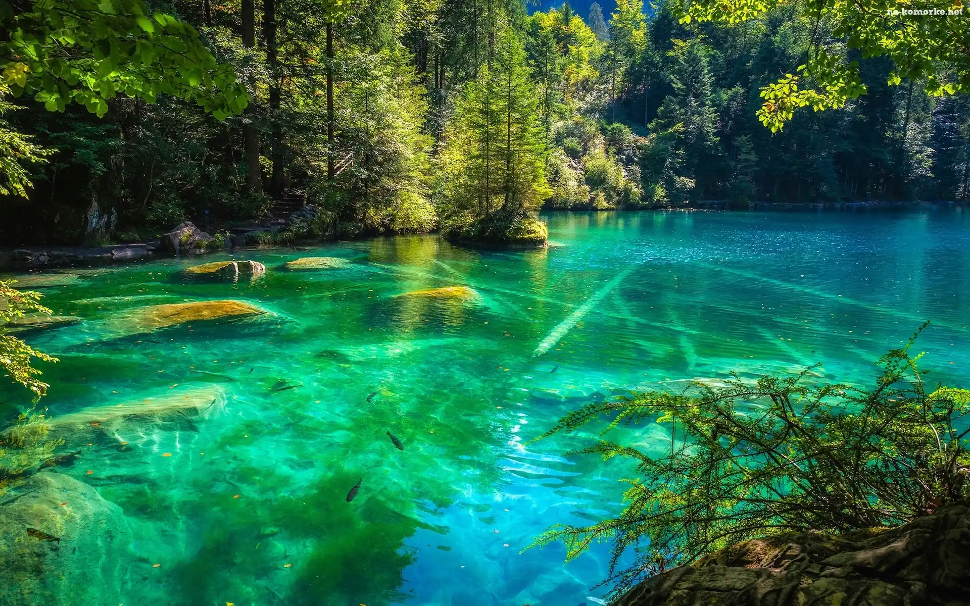 Jezioro Blausee, Drzewa, Szwajcaria, Kanton Berno na Komórkę
