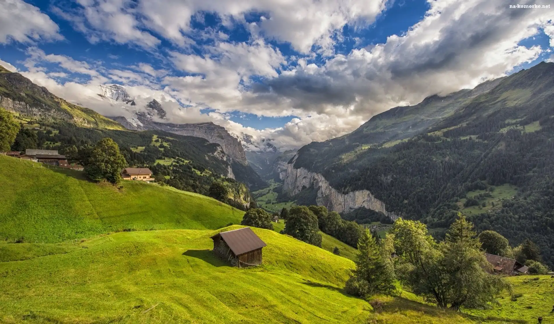 Las, Góry, Chmury, Dolina Lauterbrunnental, Szwajcaria, Alpy Berneńskie, Kanton Berno, Domy, Wengen na Komórkę |