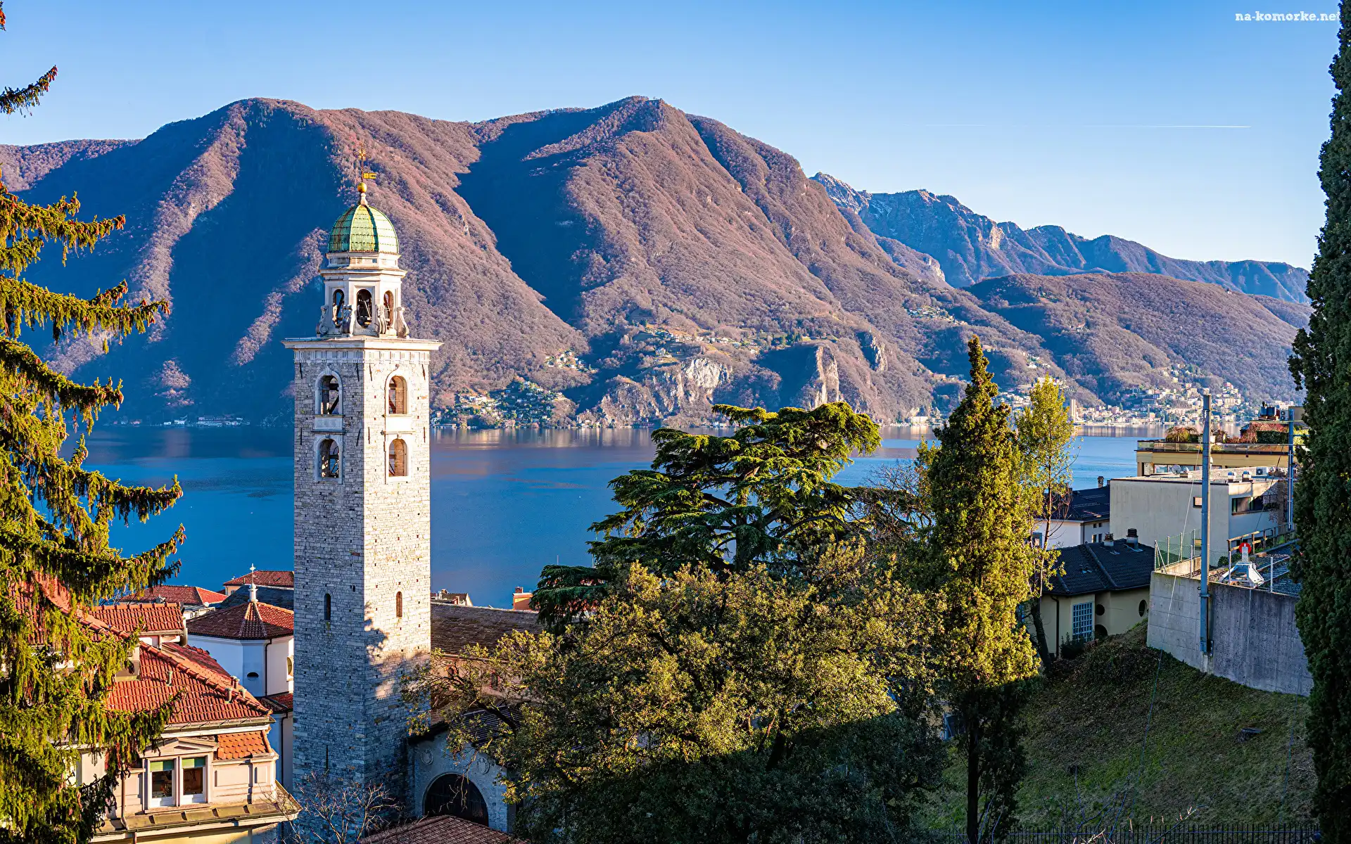 Domy, Lugano, Góra, Alpy, Kościół, Kanton Ticino, Szwajcaria, Jezioro Lugano, Katedra Świętego Wawrzyńca, Drzewa, Wieża na Komórkę |