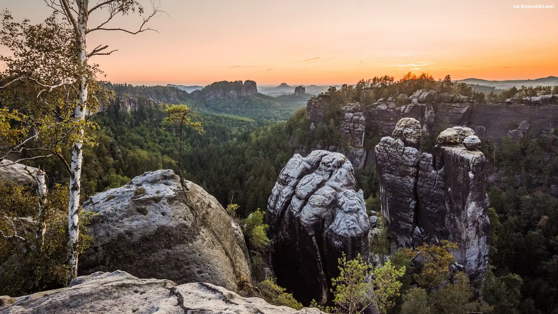 Góry Połabskie, Park Narodowy Saskiej Szwajcarii, Niemcy, Skały, Bastei, Drzewa, Zachód słońca na Komórkę |