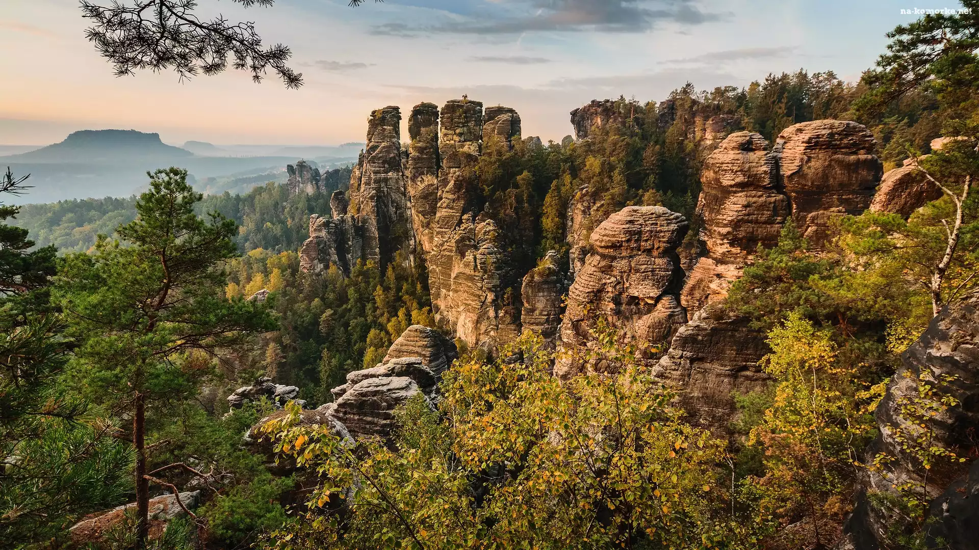 Drzewa, Skały, Góry Połabskie, Niemcy, Bastei, Park Narodowy Saskiej Szwajcarii na Komórkę