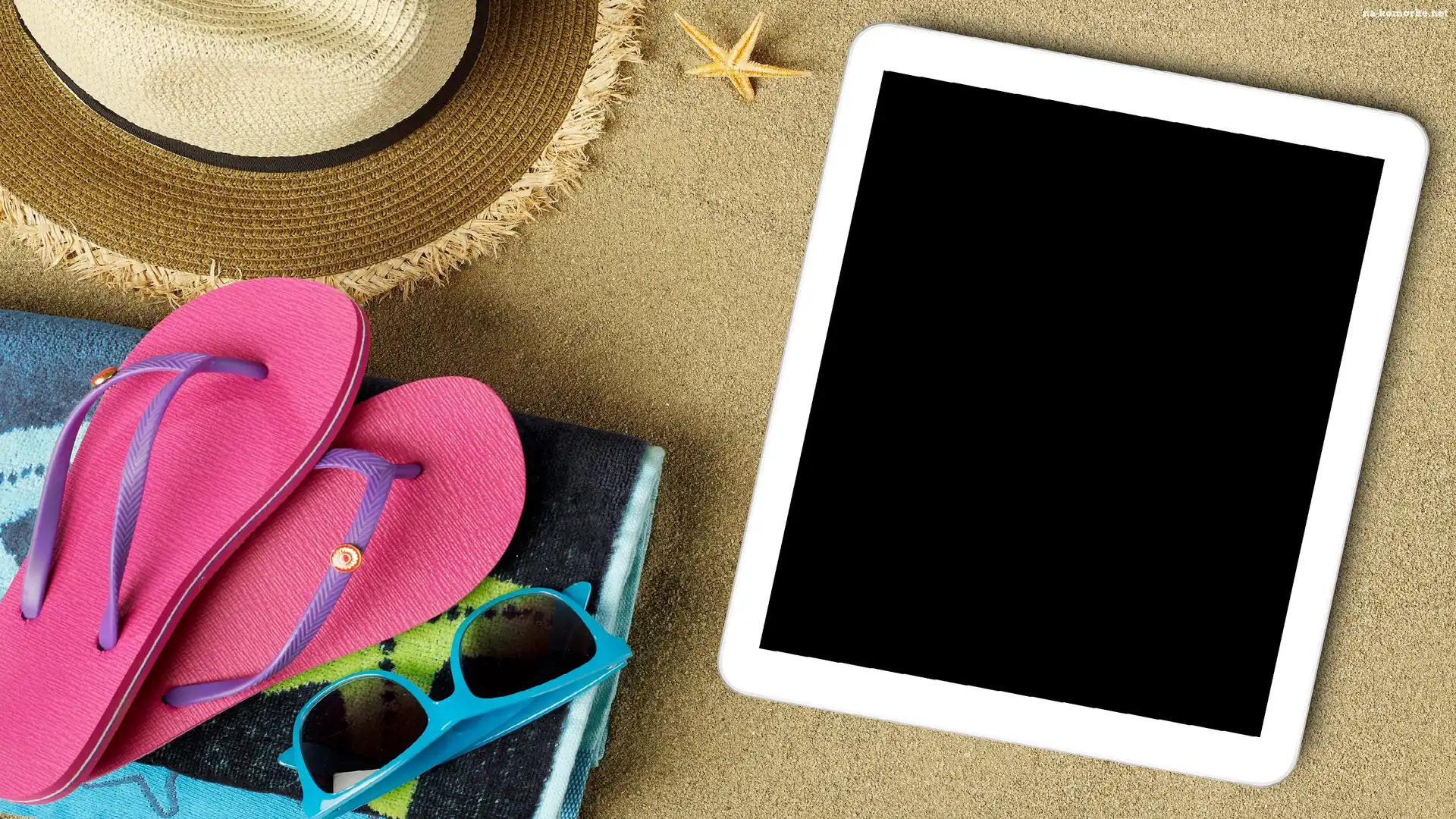 Kompozycja, Tablet, Kapelusz, Lato, Wakacje, Okulary, Japonki, Ręcznik na Komórkę