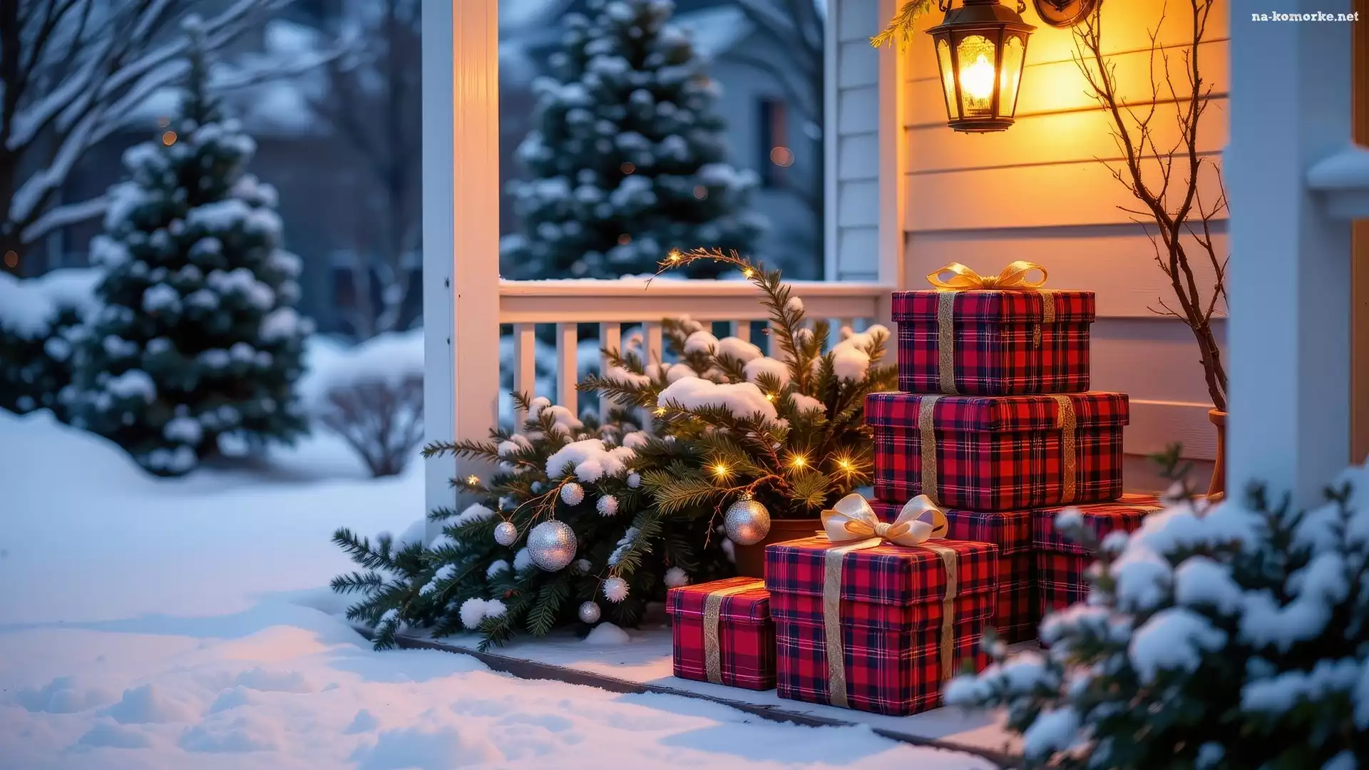Ośnieżone, Drzewa, Zima, Boże Narodzenie, Prezenty, Lampa, Taras na Komórkę