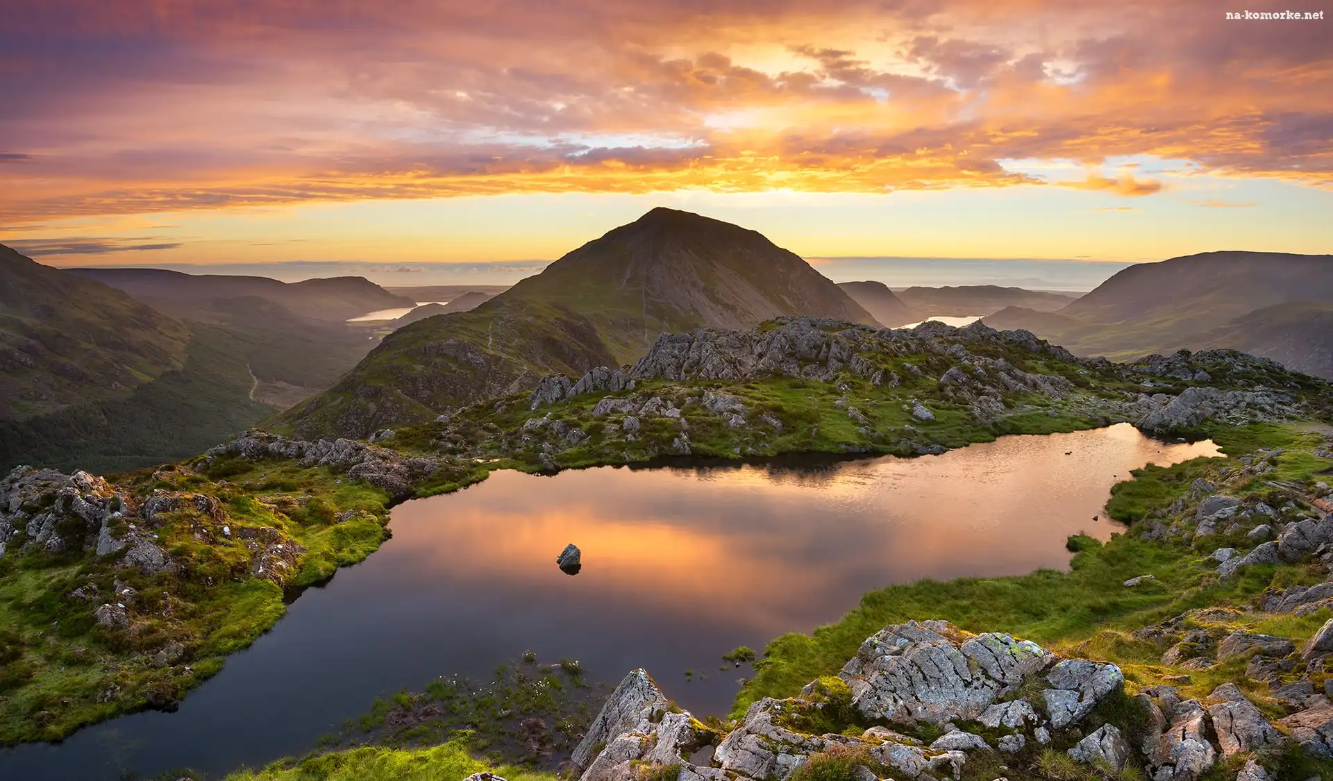 Zachód słońca, Chmury, Góry, Anglia, Innominate Tarn, Obszar Lake District, Jeziora na Komórkę |