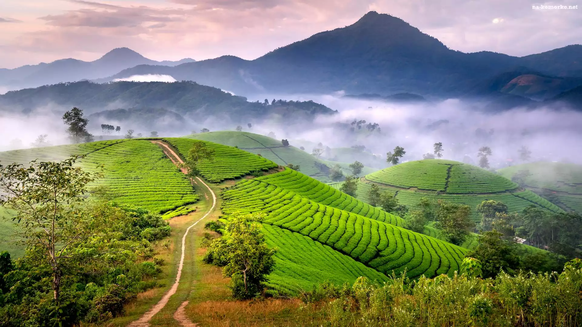 Drzewa, Ścieżka, Wzgórza, Mgła, Pola, Zielone, Long Coc Tea Hill, Góry, Plantacja herbaty, Wietnam na Komórkę |