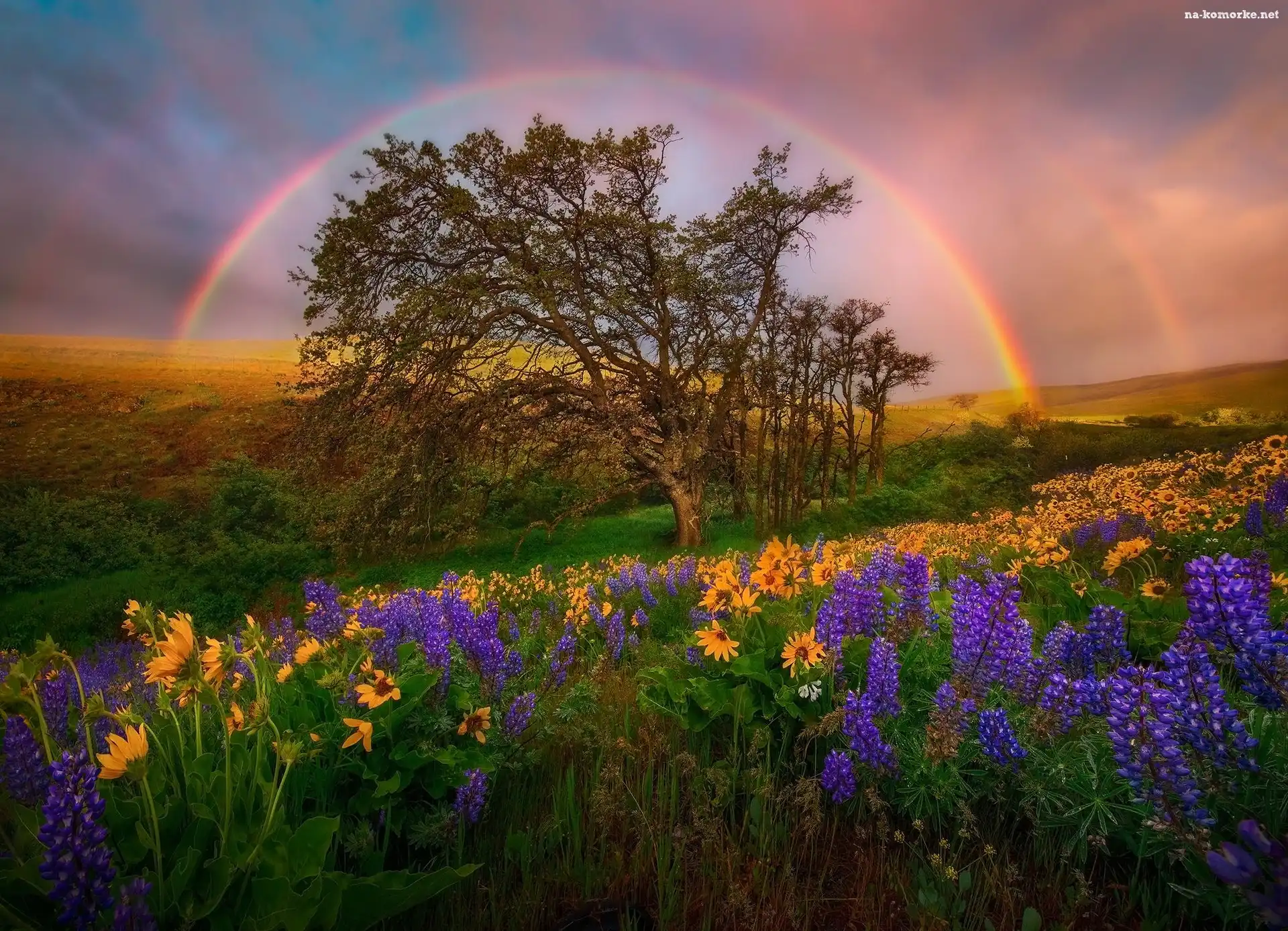 Tęcza, Pola, Drzewa, Słoneczniki, Łąki, Łubin na Komórkę
