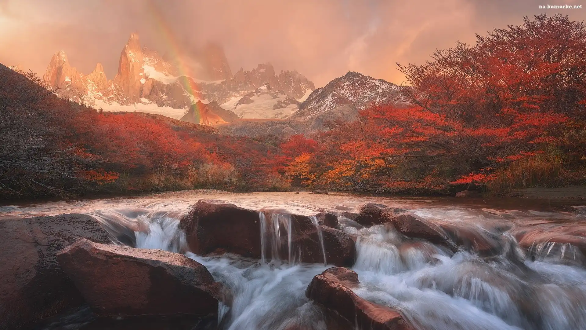 Park Narodowy Los Glaciares, Rzeka, Góry Andy, Głazy, Tęcza, Jesień, Drzewa, Kamienie, Czerwone, Argentyna na Komórkę |