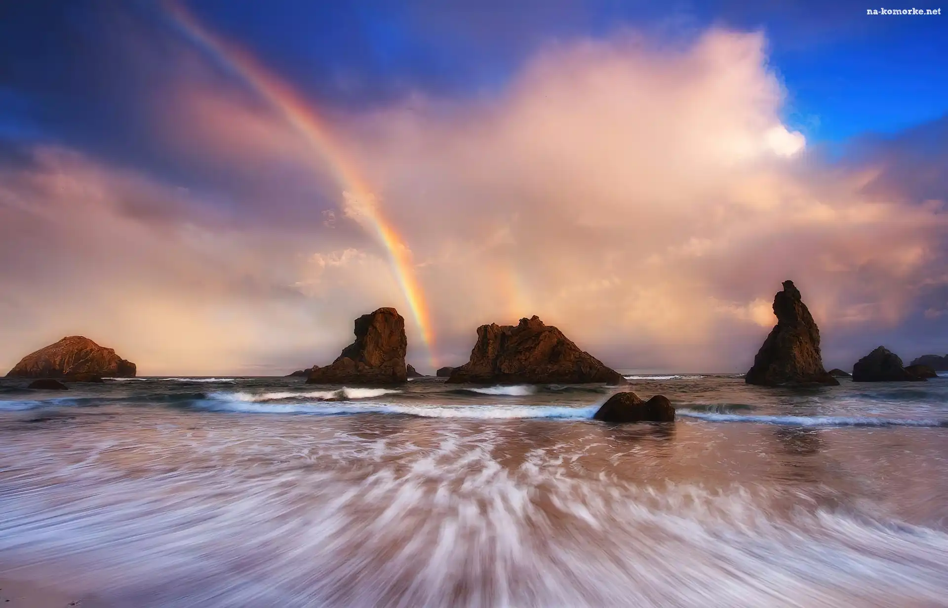 Tęcza, Chmury, Skały, Morze na Komórkę