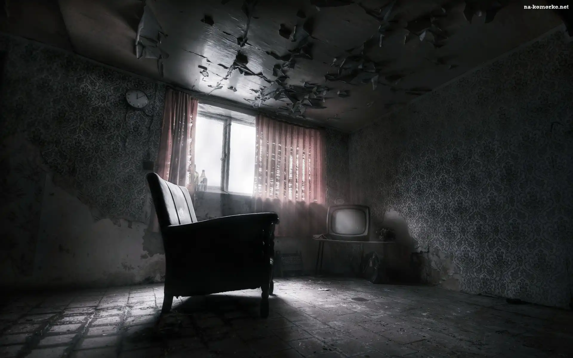 Fotel, Zniszczony, Zaniedbany, Telewizor, Pokój, Okno na Komórkę
