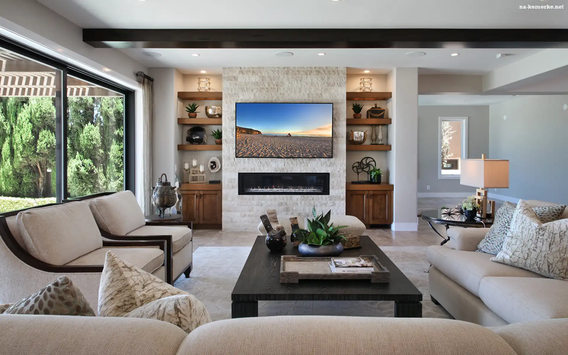 Salon, Telewizor, Kominek, Beżowe, Fotele, Kanapy, Lampa na Komórkę