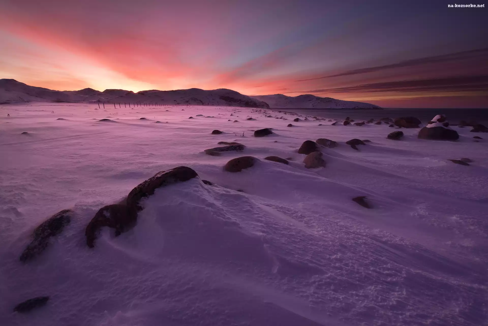Zima, Obwód murmański, Rosja, Góry, Kamienie, Zachód słońca, Teriberka na Komórkę